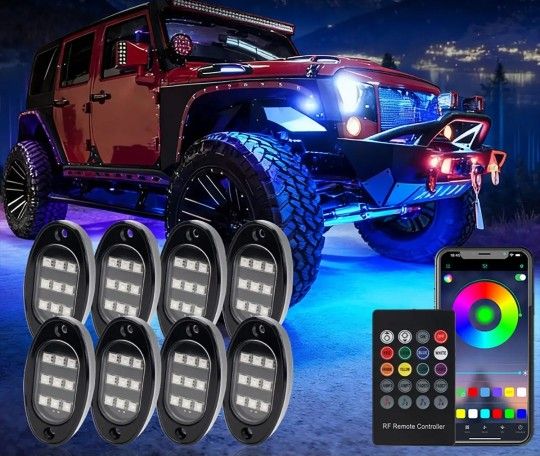 New RGB rock lights for your ride. Has app control and RF remote. Change colors, dynamic lighting modes, even music mode. Great for Jeeps, Broncos, trucks, RZRs, ATVs, motorcycles, UTVs.