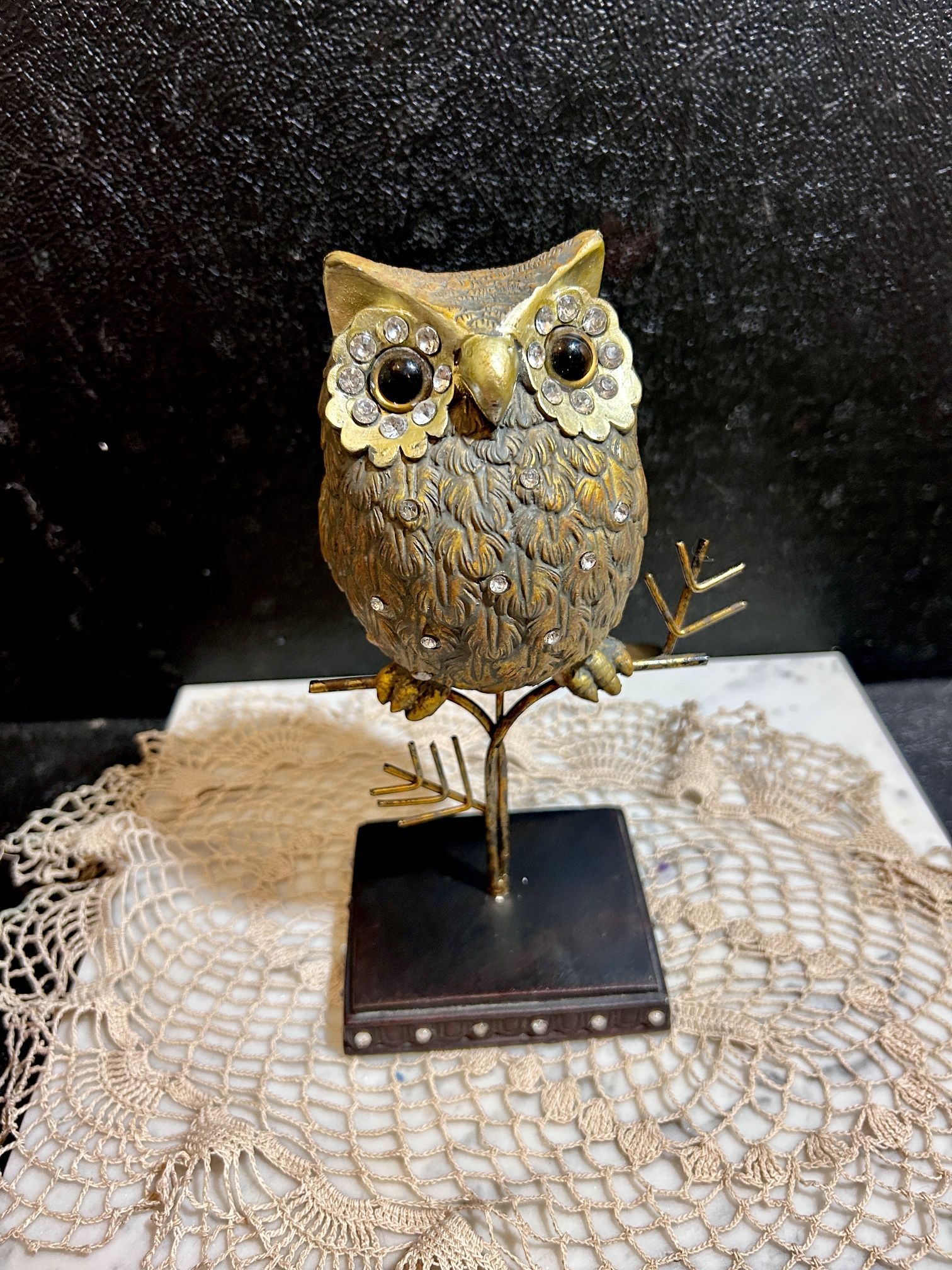 Elegant owl figurine with intricate feather detailing, perched on a decorative branch. Features sparkling rhinestone-accented eyes and is mounted on a sturdy black base. Beautifully crafted with a warm golden-bronze finish that highlights the detailed texture work. Measures approximately 8-9 inches in height. Perfect for collectors of animal-themed décor or owl enthusiasts. Contemporary decorative piece.