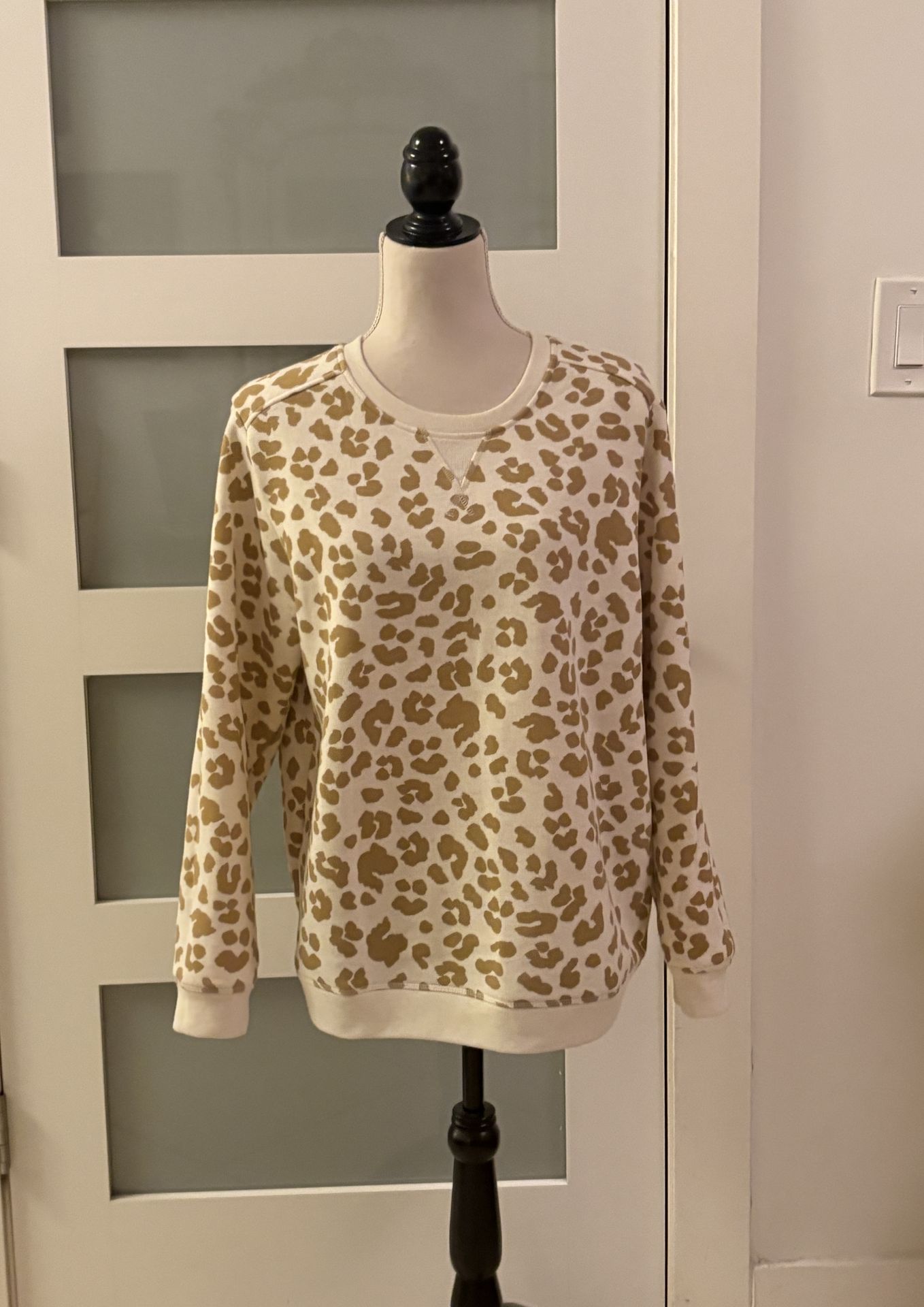 This Karen Scott leopard print crew neck sweatshirt features a comfortable, loose fit, often described as "oversized," with ribbed details at the neck, cuffs, and hem.