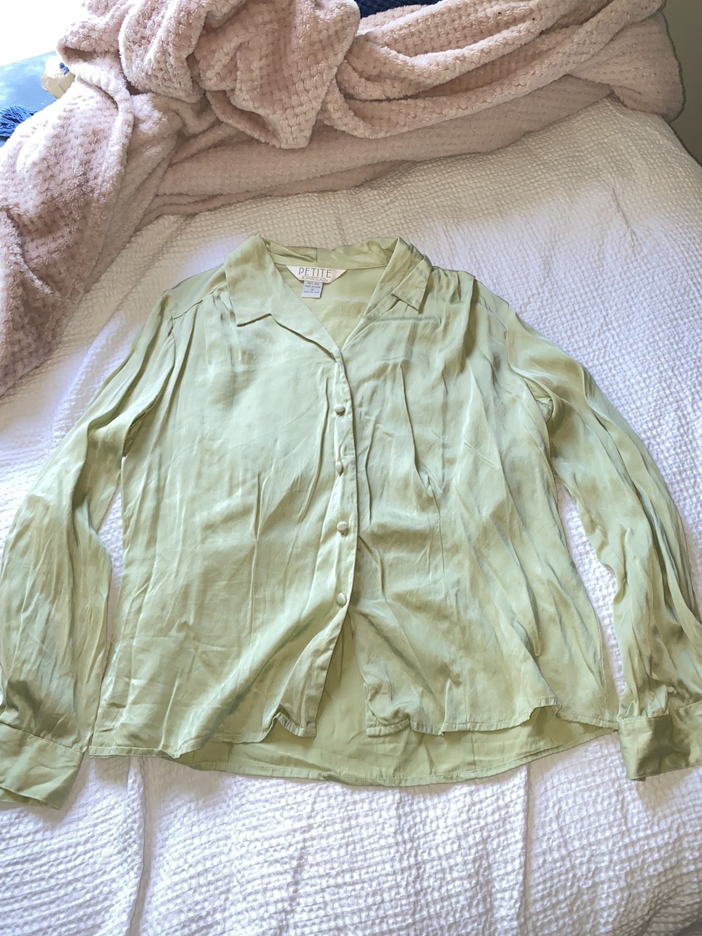 Green silk button up Would fit size M or size L Super cute and breathable!