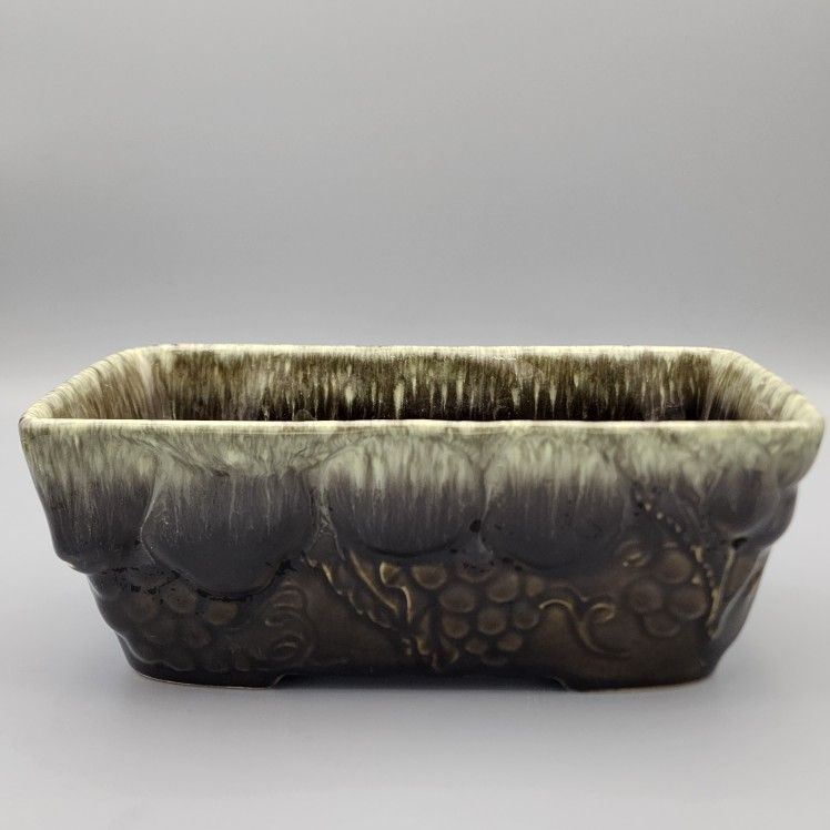 Vintage MCM Hull Planter - F18 in green and brown speckle drip glaze with grapes. Measures 9"L x 6"W x 4"H. It has one exterior chip - picture 7. Please see pictures; however, they do not do the item justice. It looks better in person than photos
