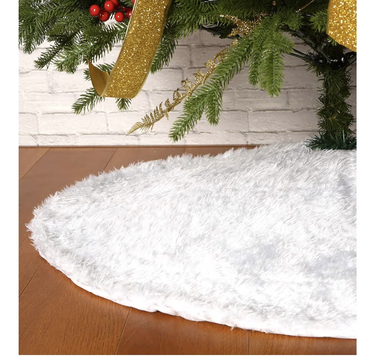 MATERIAL:Made of Plush, soft comfortable and durable. DESIGN: The pure white tree skirt reminds us the snow scene and looks especially New Year's taste in the light of the Christmas tree. SIZE: This model is 48in, and 6ft / 7ft / 8ft /9FT tree is recommended. Please pay attention to the bottom width of the tree and select the appropriate tree skirt.I
