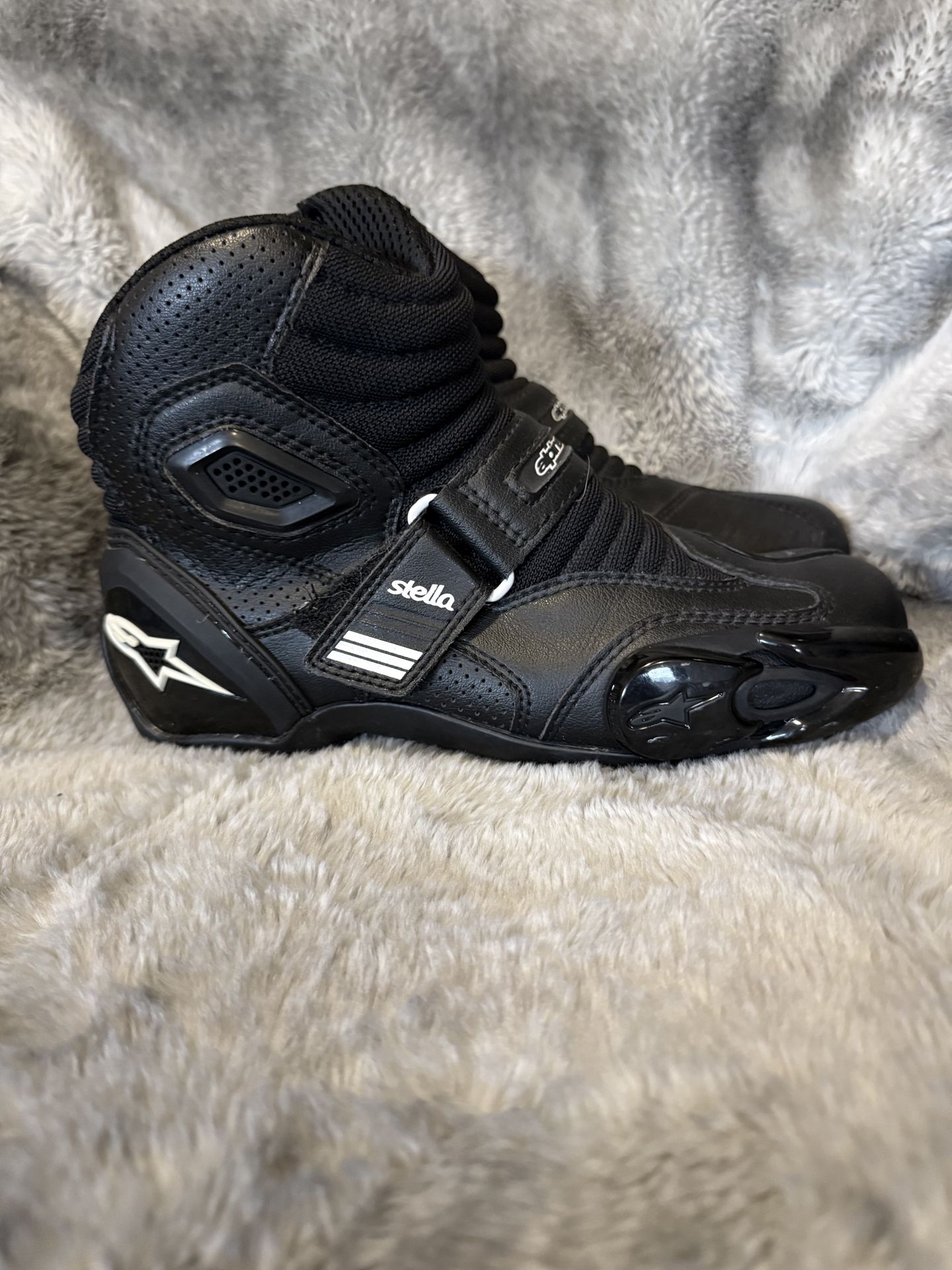 Black Alpinestars Stella motorcycle boots. Has hook and loop closure. Perforated leather sections for airflow. Protective elements on the toe and heel. Super comfy for ridinge.
