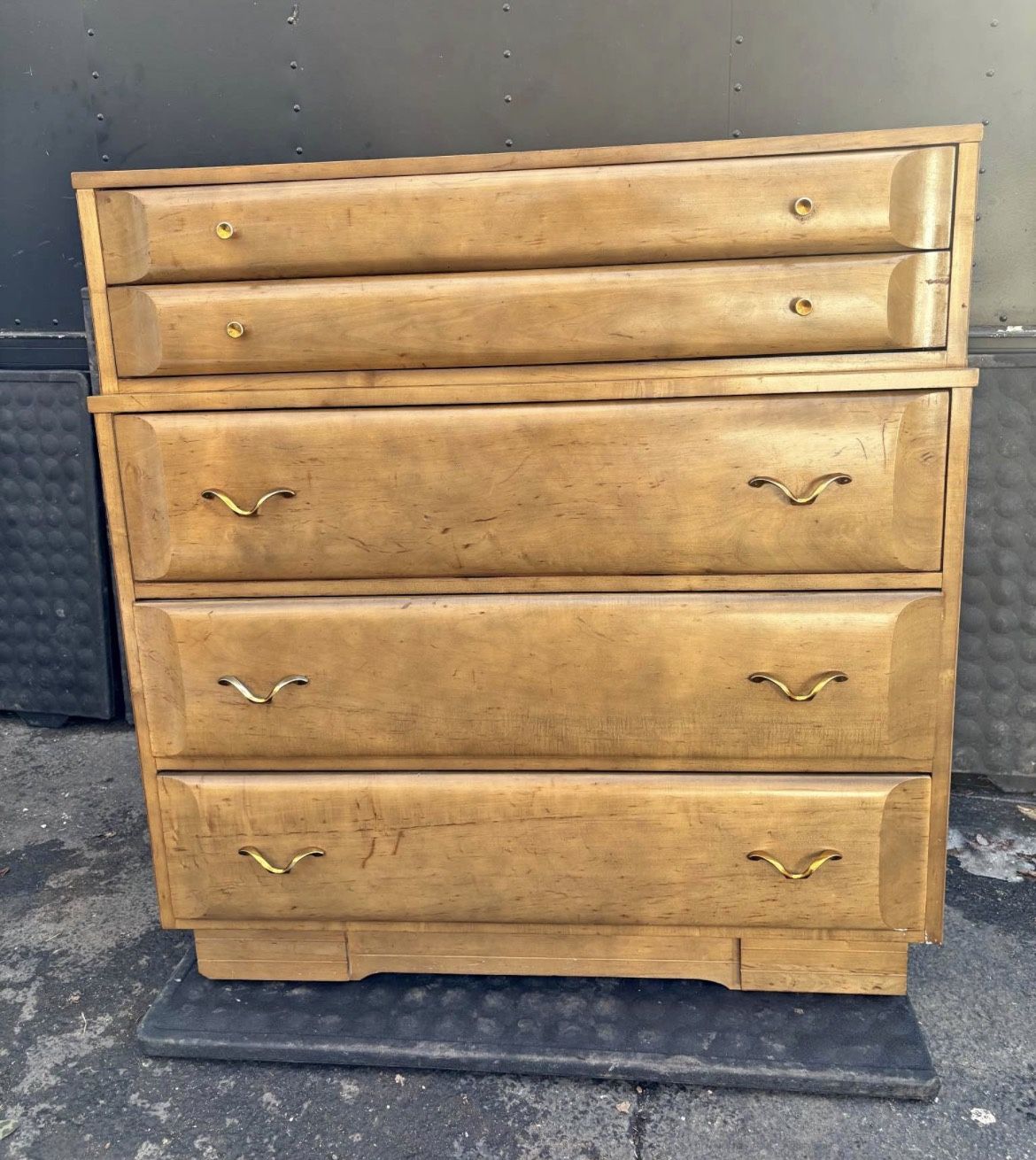 Available Mid Century 5 Drawer Chest Solid wood Joerns Bros. This piece shows some blemishes from age but in almost excellent condition. All drawers work well and they consist of solid wood and dovetailed joints. Please see all pictures and ask any questions you may have about this piece. Delivery is available to all Chicago land and suburbs. The back is stamped Drift wood. Width 40” Depth 19 1/4” Height 42 1/2”