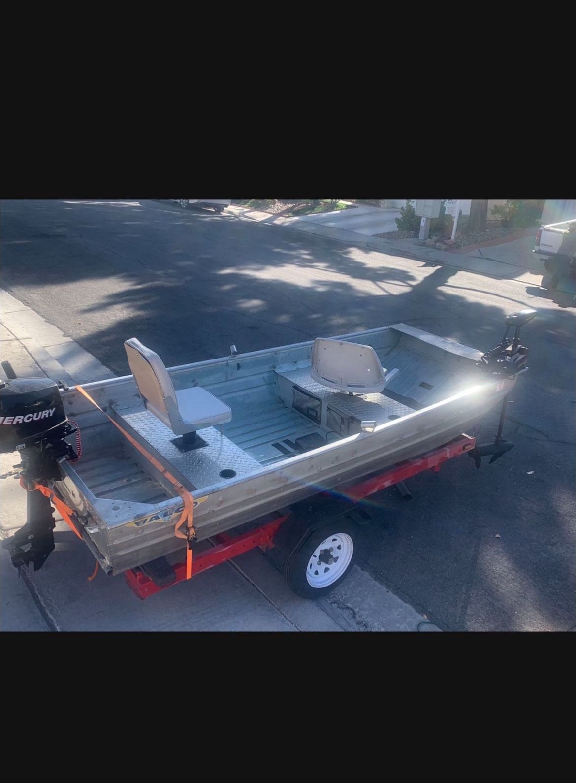 Aluminum fishing boat With motor and trolley motor Here’s why You wanna buying this boat : because it’s aluminum and it will last forever ! Light weight to save gas Small to fit anywhere u want 4 stoke motor Adjustable tolling motor Seats in great shape , garaged stored And with this smaller boat u can get into places where other boats can’t to catch a lot of fishes 😀 Asking only $3,000 obo for everything u see Clean Nevada title for boat and trailer Hurry don’t miss out !!!