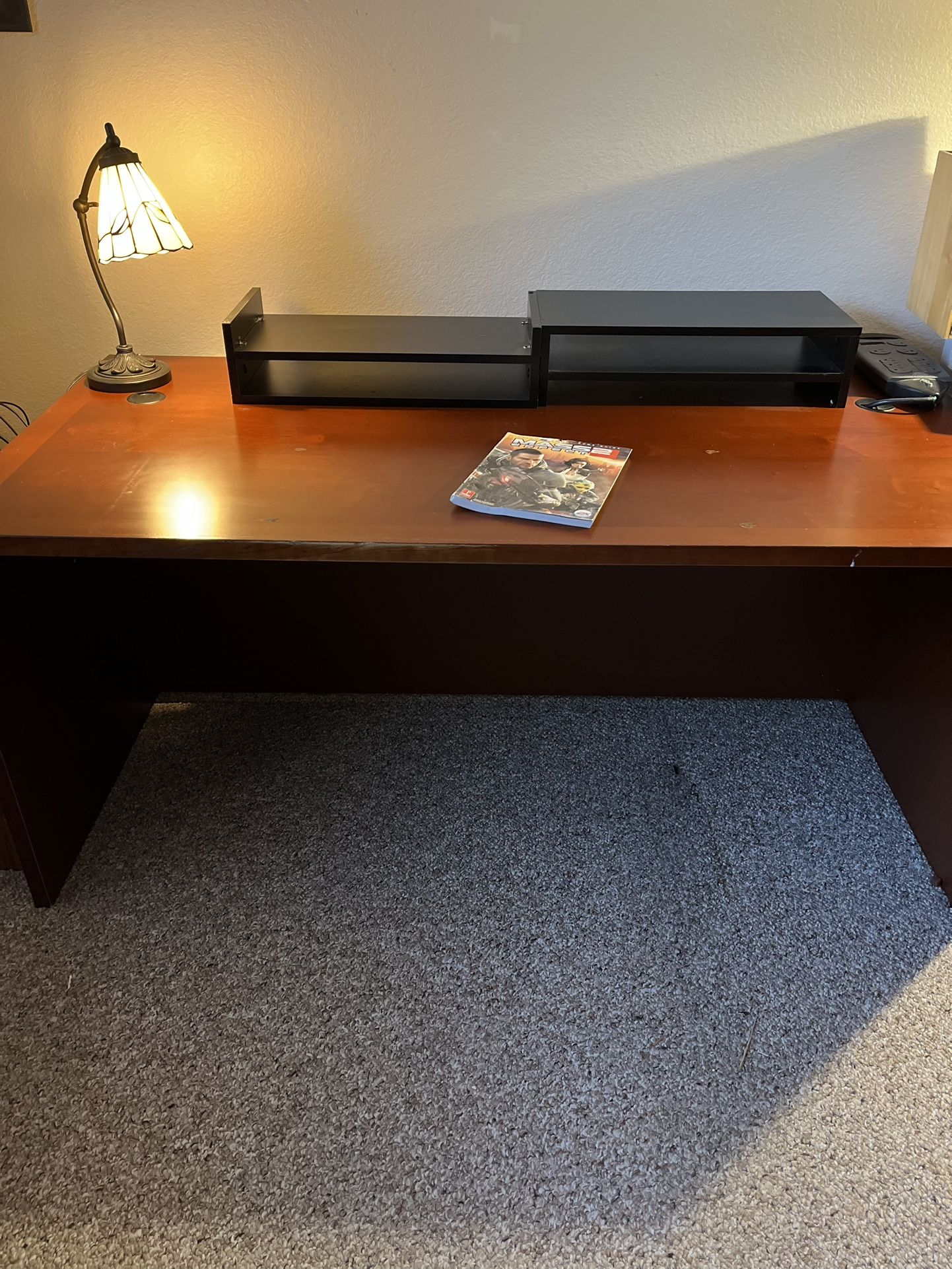 Solid wood gaming desk with raised platforms for monitors. Top of desk has cord holes for a clean look.. take it away for free. You will need a truck- no delivery