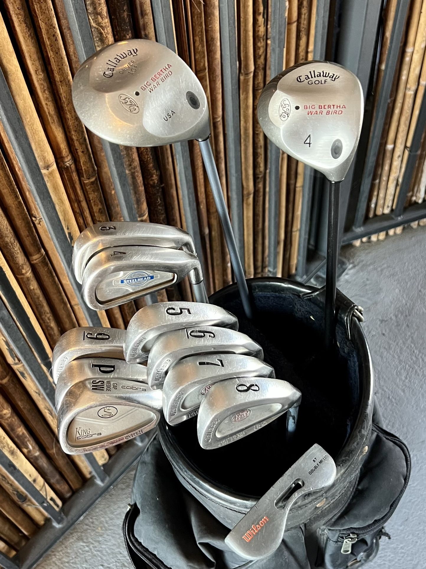 Quality clubs in excellent condition. Firm flex graphite shafts. - Callaway Big Bertha War Bird Driver & 4 Wood - Callaway Big Bertha X-14 Steelhead 3 & 4 Irons - Callaway S2H2 Irons: 5-P - King Cobra Oversize Sand Wedge - Wilson X11 Milled-Face Putter - Golf Bag - One Dozen Golf Balls KEYWORDS: Callaway King Cobra Cleveland Mizuno Nike Ping TaylorMade Titleist Bridgestone MacGregor Ben Hogan Srixon Wilson Top Flite Flight Top-Flite Top-Flight Strata PXG Vokey BeCu BeNi