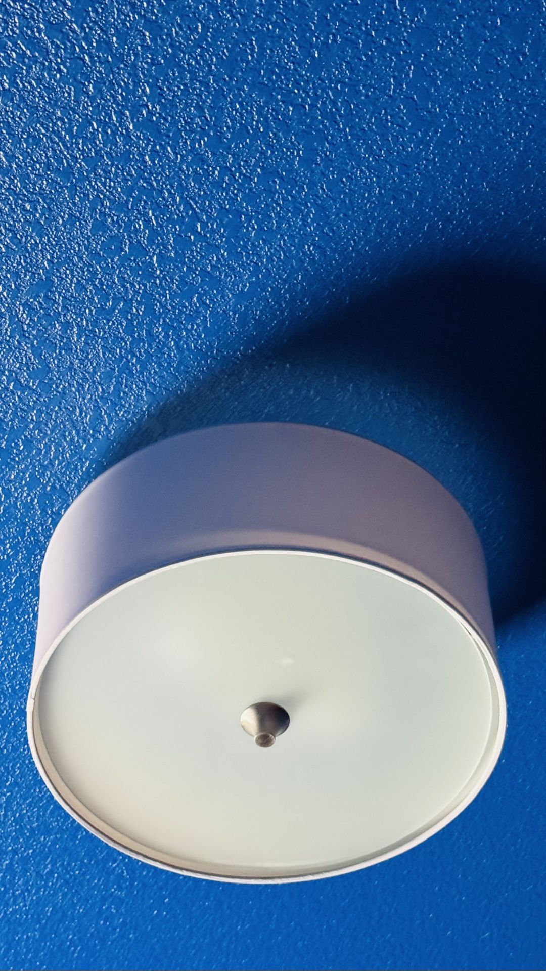 Brushed nickel flush mount with off white fabric hardback shade. Amazon on sale $100. Pic attached