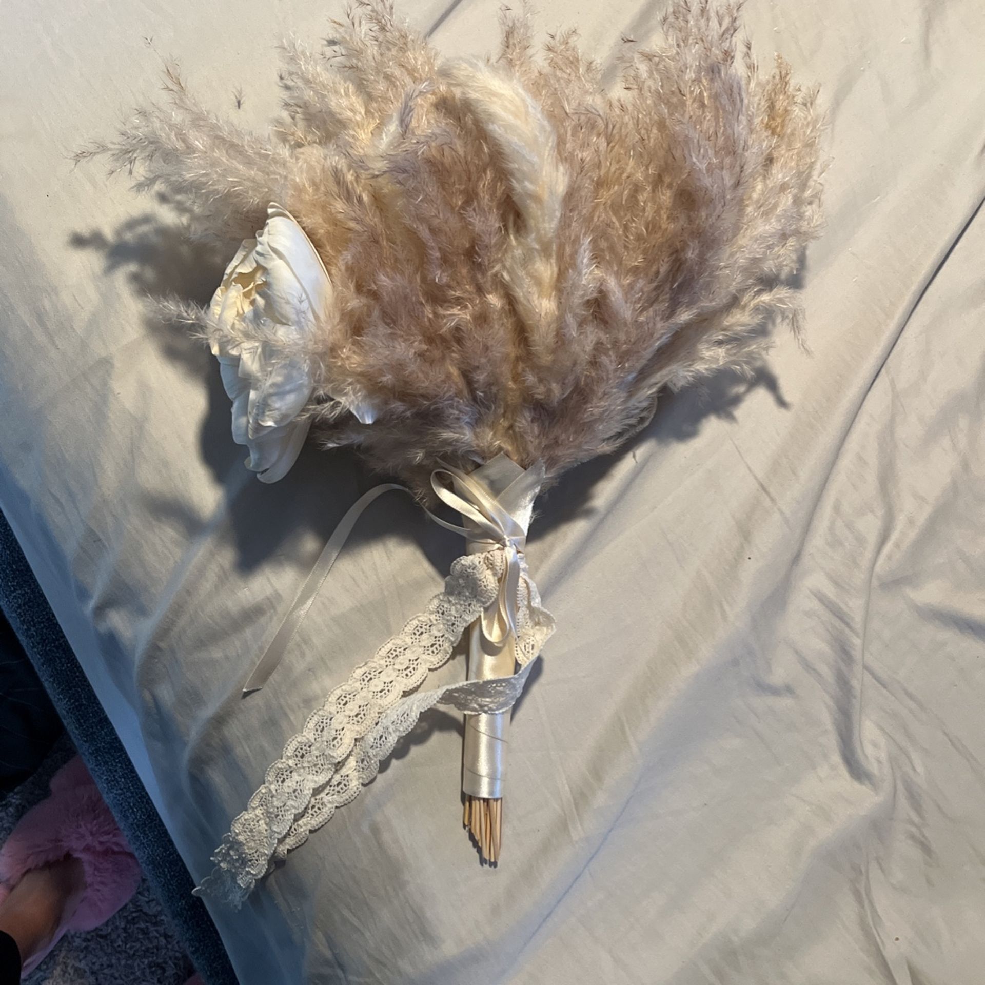Pompas bouquet with off white roses Wrapped with satin & lace detail Just needs to be fluffed back out