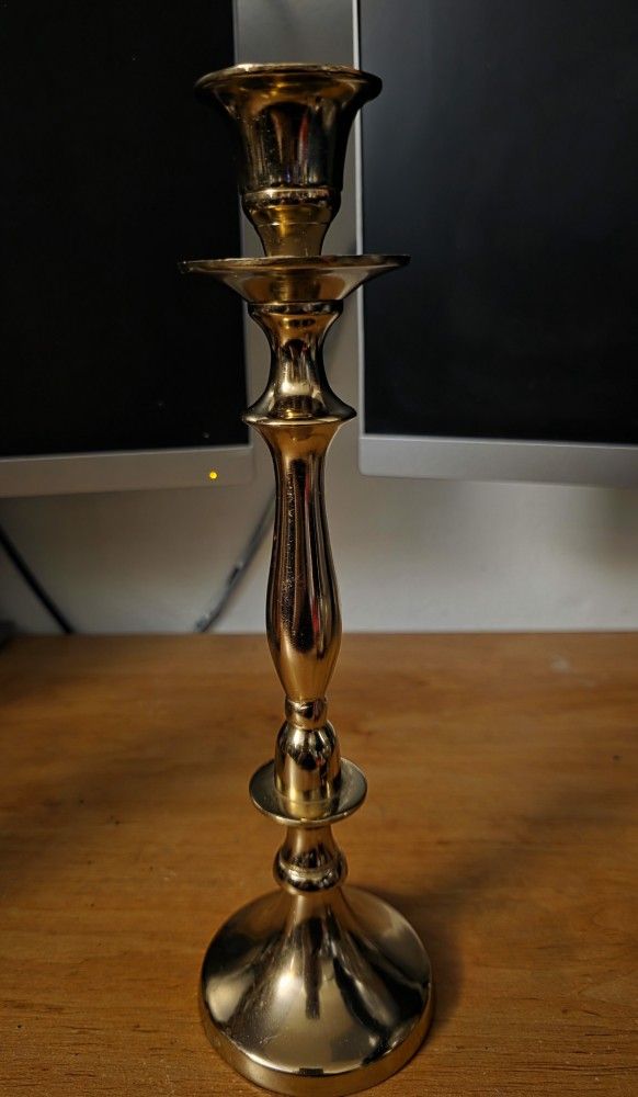 New with tags, never been used, single taper candle holder. It features a classic, elegant design with a polished finish and is designed to hold one standard-sized taper candle. The piece has a traditional, symmetrical shape with several rounded sections along the stem and a flared base for stability. It has a bright, polished golden color. Suitable for use in a living room, dining room, or on a mantelpiece to create a classic ambiance.