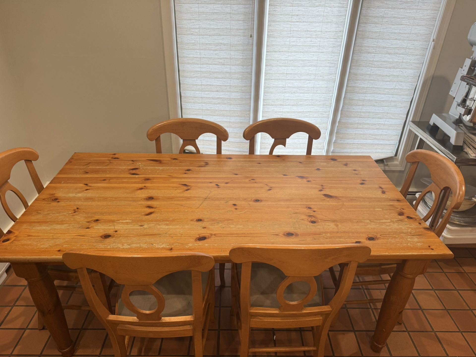 We had all of the chairs reupholstered for comfort. The table surface needs refinishing, but with a bit of attention, it can look brand new again. This is perfect for someone who enjoys restoration projects and wants a vintage piece at a great price. One of the chair back needs attention (see pic) Pick up only in Ramsey, NJ