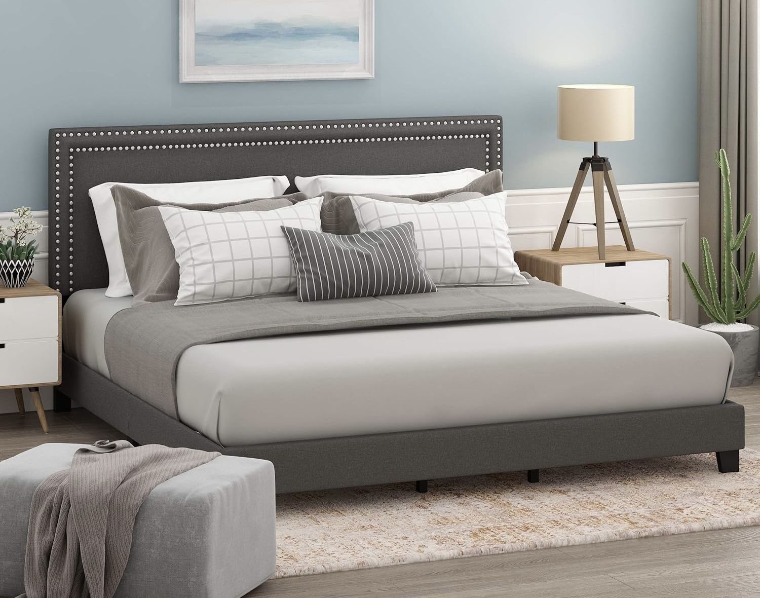 NEW King Bed Frame No Box Spring Needed, Double Row Nail Head Upholstered Platform Bed Frame !