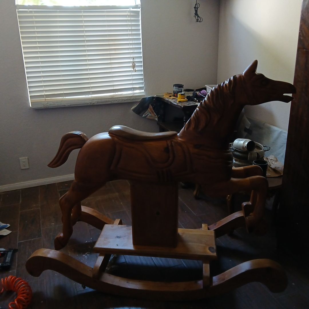 Vintage Hand carved solid wood rocking horse. Saddle sits 39 inches of the h e ground life size pony rocking horse $3000 or $/trade obo