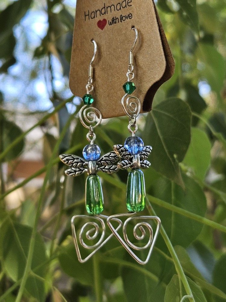 Silver, blue and green firefly insect bug dangle earrings. Handmade, unique gift.
