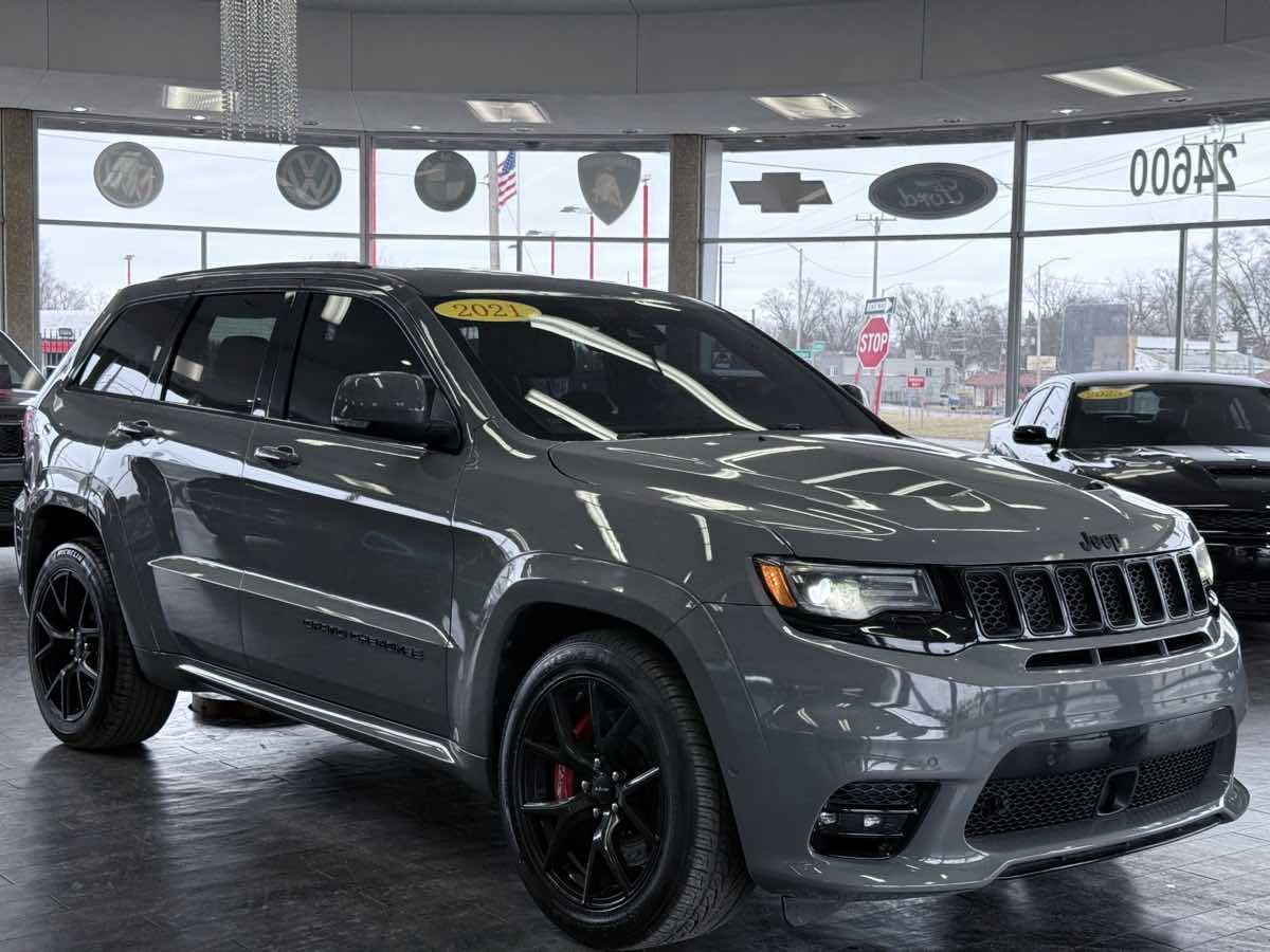 The 2021 Jeep Grand Cherokee SRT 4x4 is a masterful blend of style, power, and advanced technology, dressed handsomely in Sting-Gray Clearcoat. Its bold exterior is complemented by the elegant Sepia/Black interior, offering a luxurious and sporty driving experience that's sure to turn heads. Under the hood, the beastly 6.4L 8-cylinder engine roars with authority, perfectly matched with a Four Wheel Drive drivetrain for exceptional handling and off-road capabilities. This robust combination positions the SRT 4x4 as a true performance SUV, ideal for those seeking both adventure and sophistication on and off the road. Among its numerous features, the Grand Cherokee SRT offers active cruise control and a forward collision warning system that provides both comfort and peace of mind on long journeys. The dual-pane panoramic sunroof floods the cabin with natural light, while the premium Bluetooth-enabled high-performance audio system treats occupants to a rich auditory experience. Blind spot monitoring and parking assist ensure that navigating through tight spots and busy urban environments is effortless. Additionally, rain-sensing wipers and ventilated seats add a layer of convenience and comfort, making every drive enjoyable irrespective of the weather. For those who require utility alongside performance, the Grand Cherokee SRT's towing package enhances its versatility, while the Trailer Tow Group IV and high-performance brakes exemplify its rugged capability. The stylish 20" x 10.0" black satin aluminum wheels ensure that this SUV not only performs exceptionally well but also strikes an imposing presence on the road. With heated seats for added comfort during colder months, and an array of cutting-edge technology, this vehicle is designed for those who demand excellence and performance without compromise. From its captivating aesthetics to its sophisticated interior, the 2021 Jeep Grand Cherokee SRT 4x4 is the pinnacle of modern-day SUV engineering.