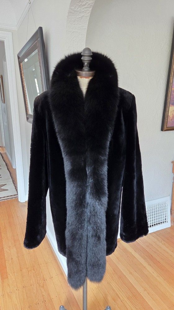Black Sheared Mink Fur Coat With fox Fur Collar Size XL NO OFFERS