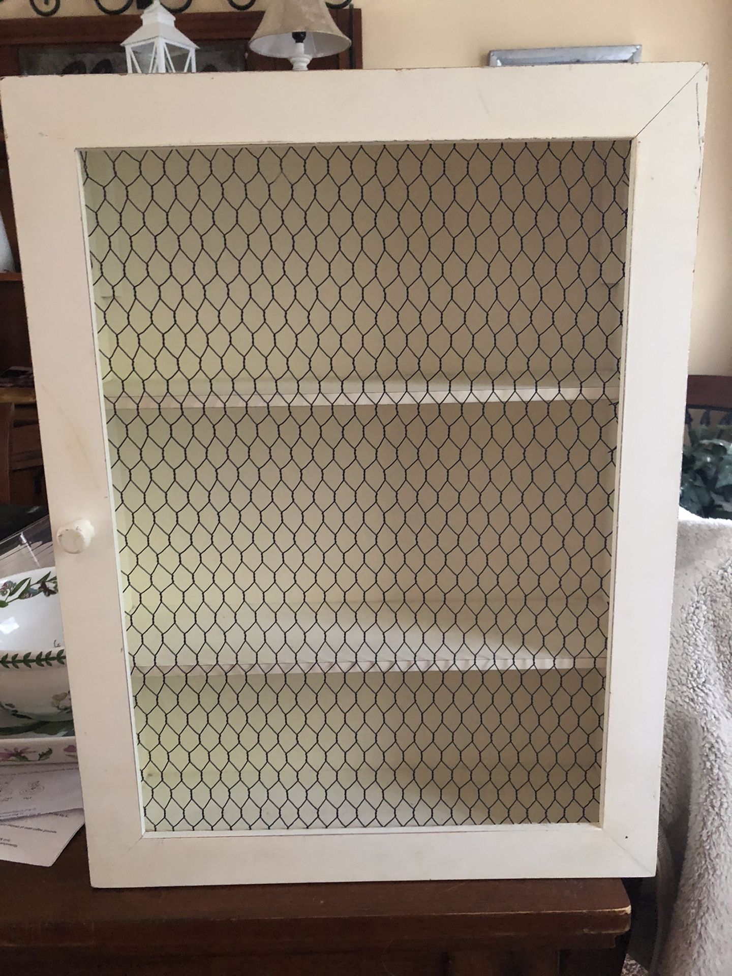3 shelve cabinet with wire door 18” wide by 26” tall cream color