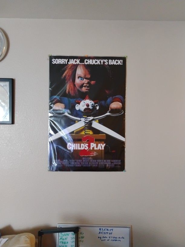 Classic Child’s Play 2 poster featuring Chucky with the iconic “Sorry Jack… Chucky’s Back!” tagline. Perfect for horror fans or collectors, this bold and recognizable artwork makes a great statement piece for a room, game room, or movie space. A must-have for any Chucky or horror collection.