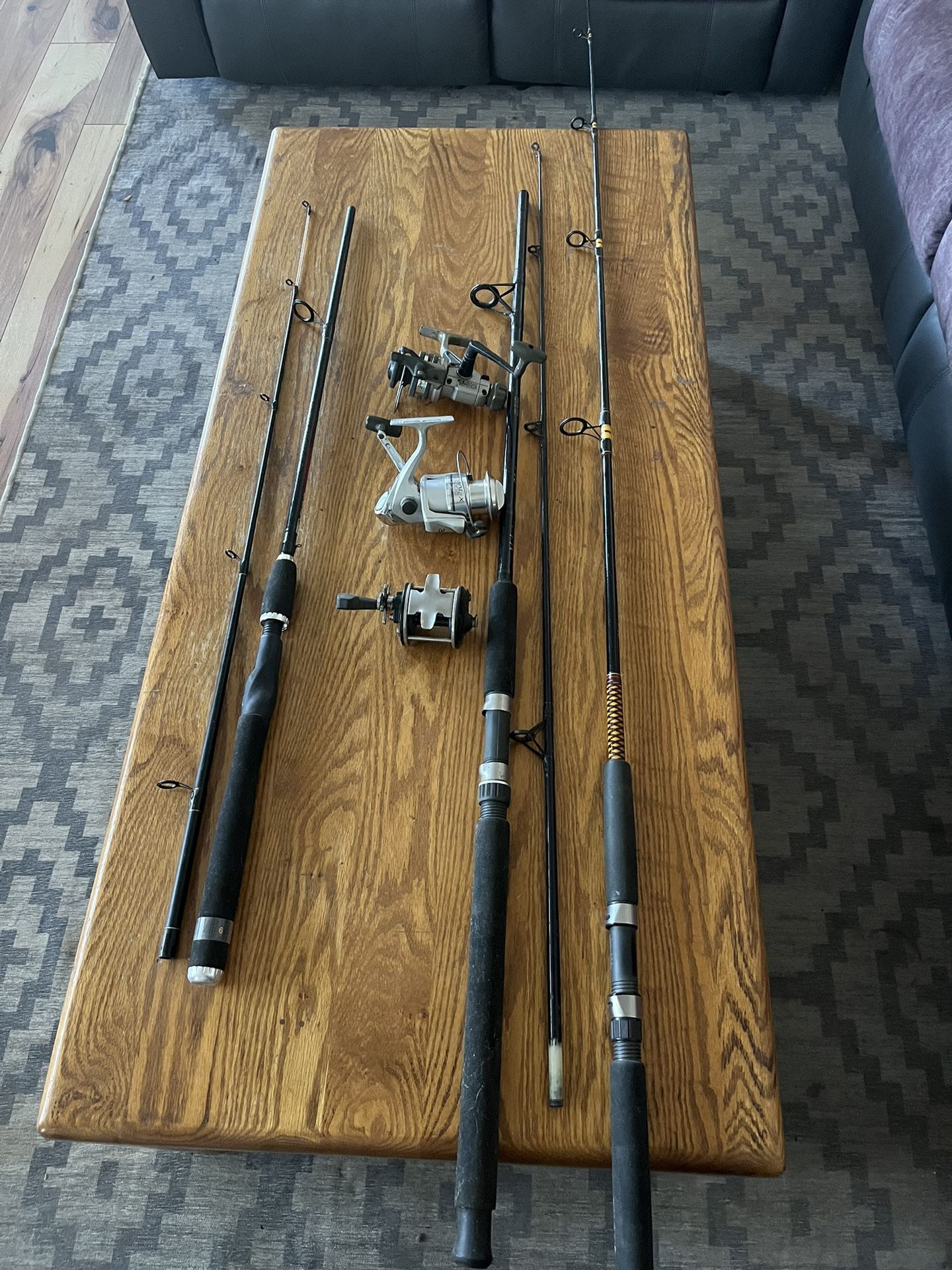 Selling 3 Fishing Rods and 3 Fishing Reels that were all not used much Everything works good and Looks Good The 3 Reels included are: 1. Daiwa EL 1655H. Very Good Shape 2. Daiwa Regal X 3500c. Very Good Shape 3. Penn 9 Level Wind Reel. Good Shape The 3 Rods included are: 1. Shakespeare Alpha: BWS 80-2MH. Action: Medium Heavy (12-30 lb line) 2. Shakespeare Ugly Stick: BWS 1101 7 Foot (2.10 mm) Action M (12-30 lb) 3. Rhino Kevlar: RKS662MH 6 foot 6 Med./Heavy. 10-2- Lb. One 1/4 to 1 oz lure Serious inquiries only From a Smoke Free and Pet Free Home Ready for Use