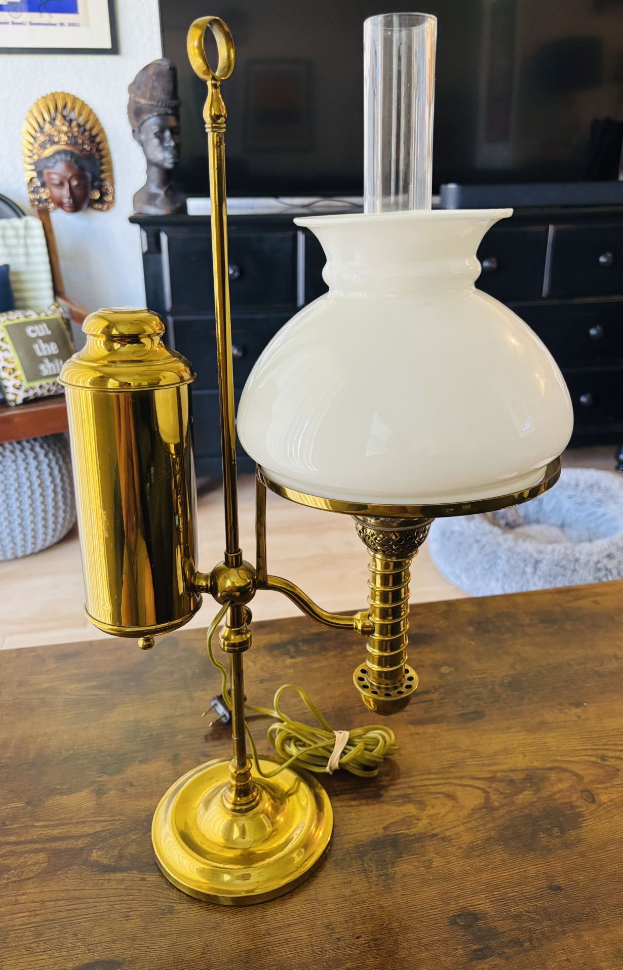 Electrified brass student lamp with a white milk glass shade and a clear chimney.