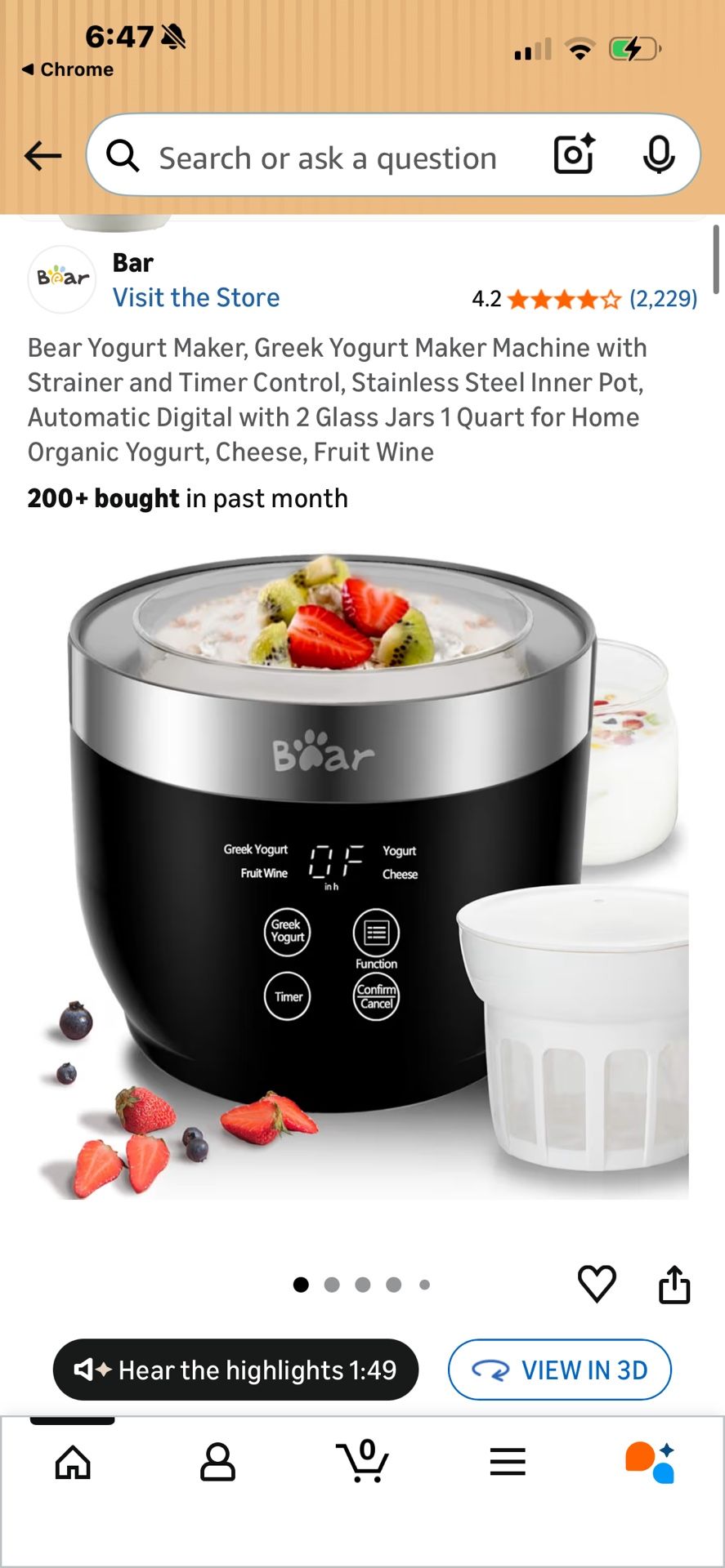 Bear Yogurt Maker Greek Yogurt Machine w/ Strainer & Timer 2x 1-Quart Jars