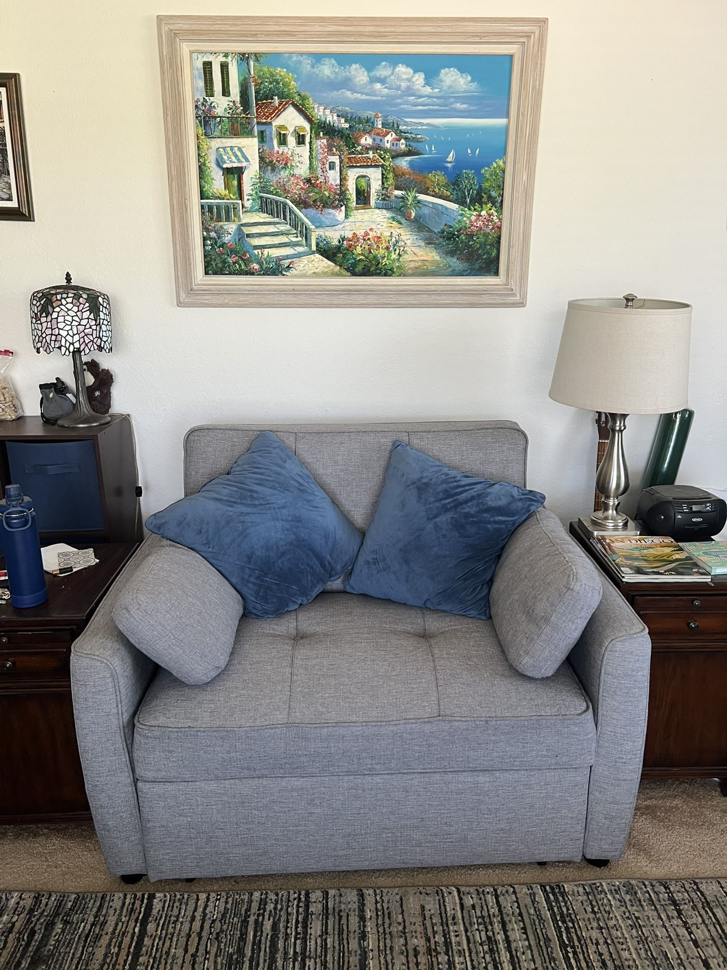 Small couch with fold out twin size bed. Great for studio, small apartment, kids room, office.