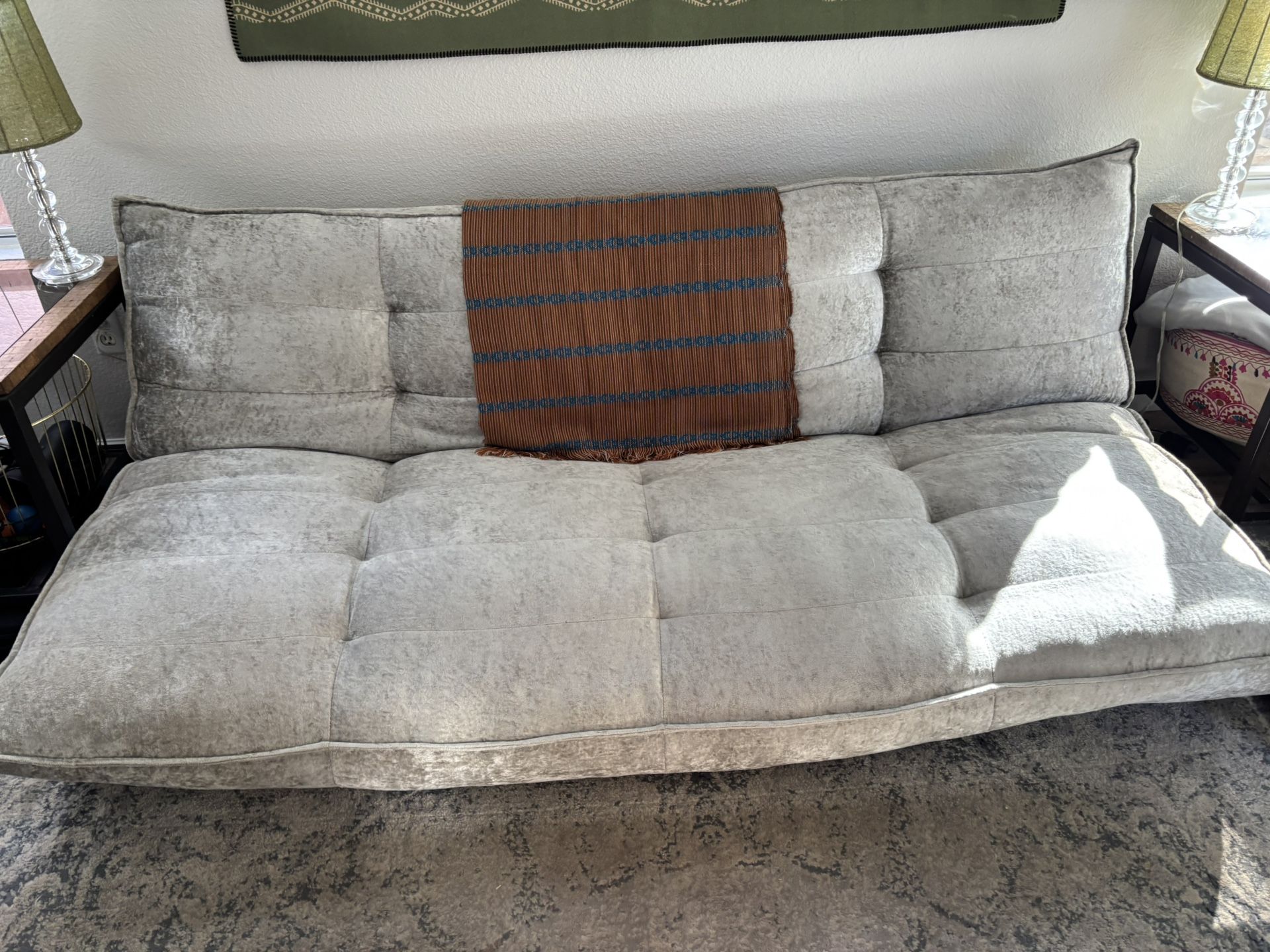 "The Greta" by Urban Outfitters is a gray foldable couch in excellent condition. Sleek, low-profile design that fits any space, and it easily folds flat to create a comfortable guest bed. I’ve used it with a mattress topper for visitors and it’s been perfect. Quality build and has held up beautifully for years. Sells new for 900 plus tax.