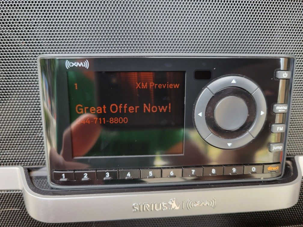 SiriusXM satellite radio portable boom box. Made by Audiovox. Very high quality sound from a small speaker system. Comes with remote, AC, and DC power cords. Also has an aux input for playing other devices. Onyx receiver, ready for subscription. Vehicle dock system with aux cord, power cord, and antenna. Spare Vehicle dock only (no cords, just the plastic docking station). Fully functional, nothing wrong with it. Enjoy crystal clear high definition audio in your home and while traveling. I love taking this setup camping where I can enjoy music away from cell signal or radio towers. Everything included to work as-is. All you need is a subscription. Or a bunch of emails to sign up for free trials.