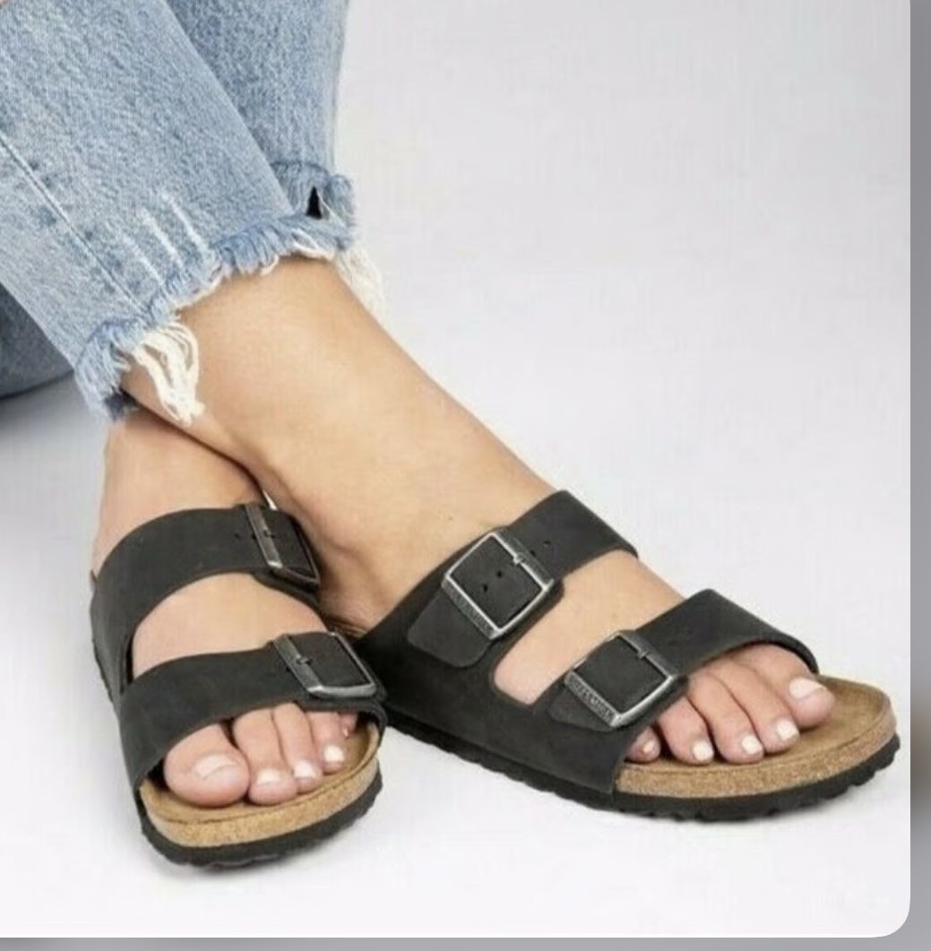 BIRKENSTOCK Arizona Oiled Leather -sandals No tag or box; black; Minor markings from store handling but nothing super noticeable!- please check all the pics/details and ask questions before purchasing SOLD AS- size 39-250 L-8 M- 6 unisex, true to size; An icon of timeless design and legendary comfort, the Arizona sandal has been defining style since 1973. Oiled leather only looks better with wear, giving each pair a unique, well-traveled patina. With an original contoured footbed for support, it'll feel uniquely yours wherever you take it. Contoured cork-latex footbed creates custom support with wear Oiled leather upper gives each pair a unique finish Suede footbed lining helps keep you comfortable EVA sole is flexible & lightweight Two straps with adjustable metal pin buckles Made in Germany All sales are final Smoke&pets free house Thx