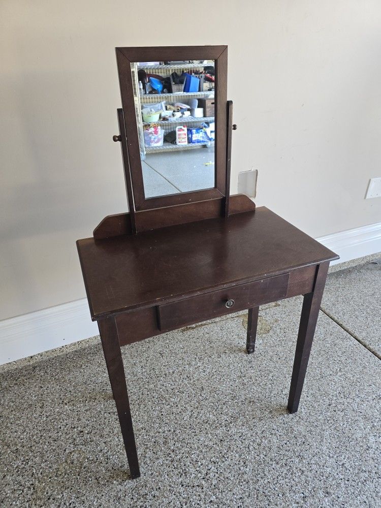 Table with mirror and drawer. Paid $104 About 52 tall 16 deep and 30 wide. Not too big with drawer We had it as a make up desk Vanity with mirror