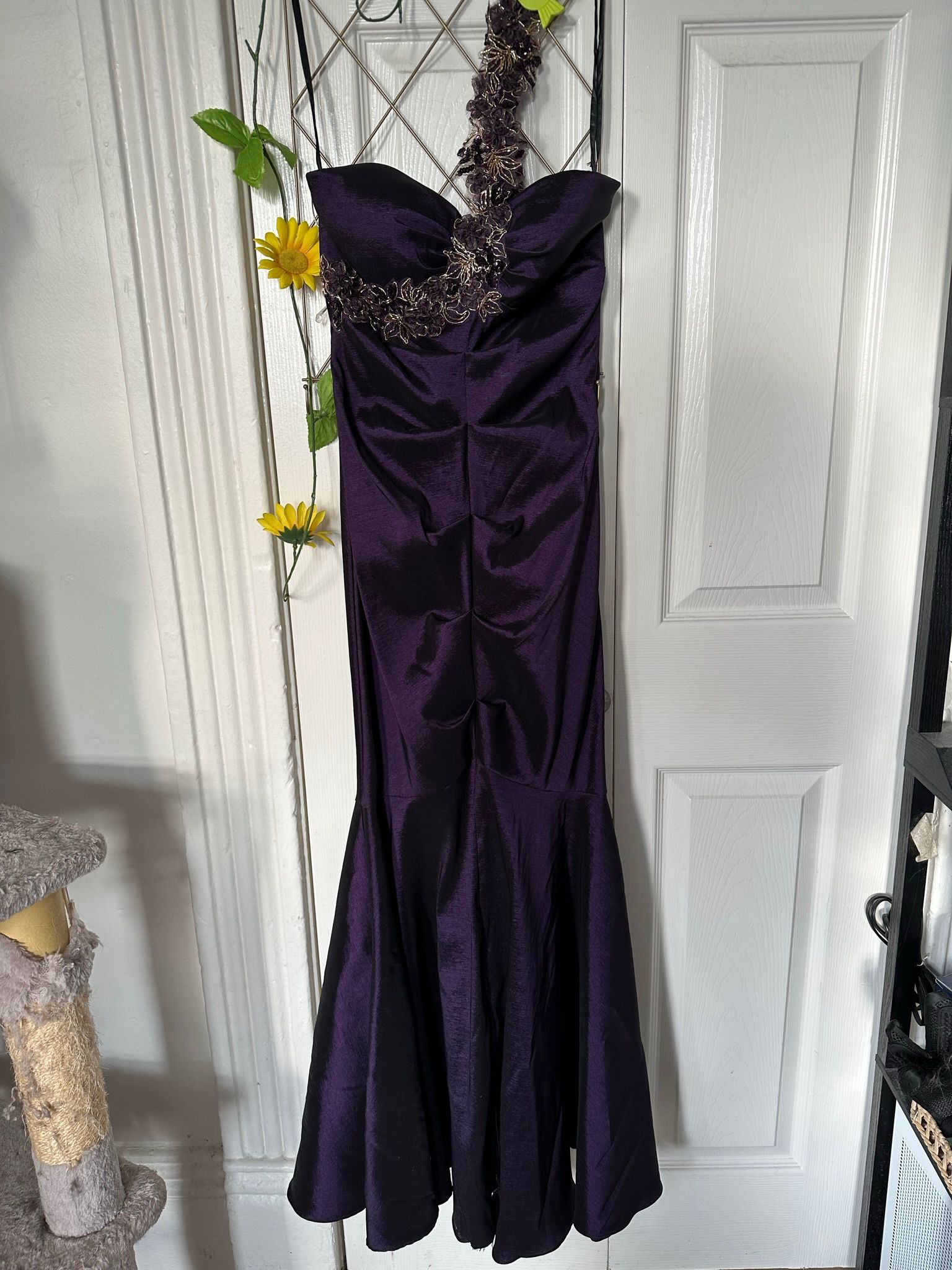 Chic strapless design. Rich dark purple hue. Ideal for formal events.
