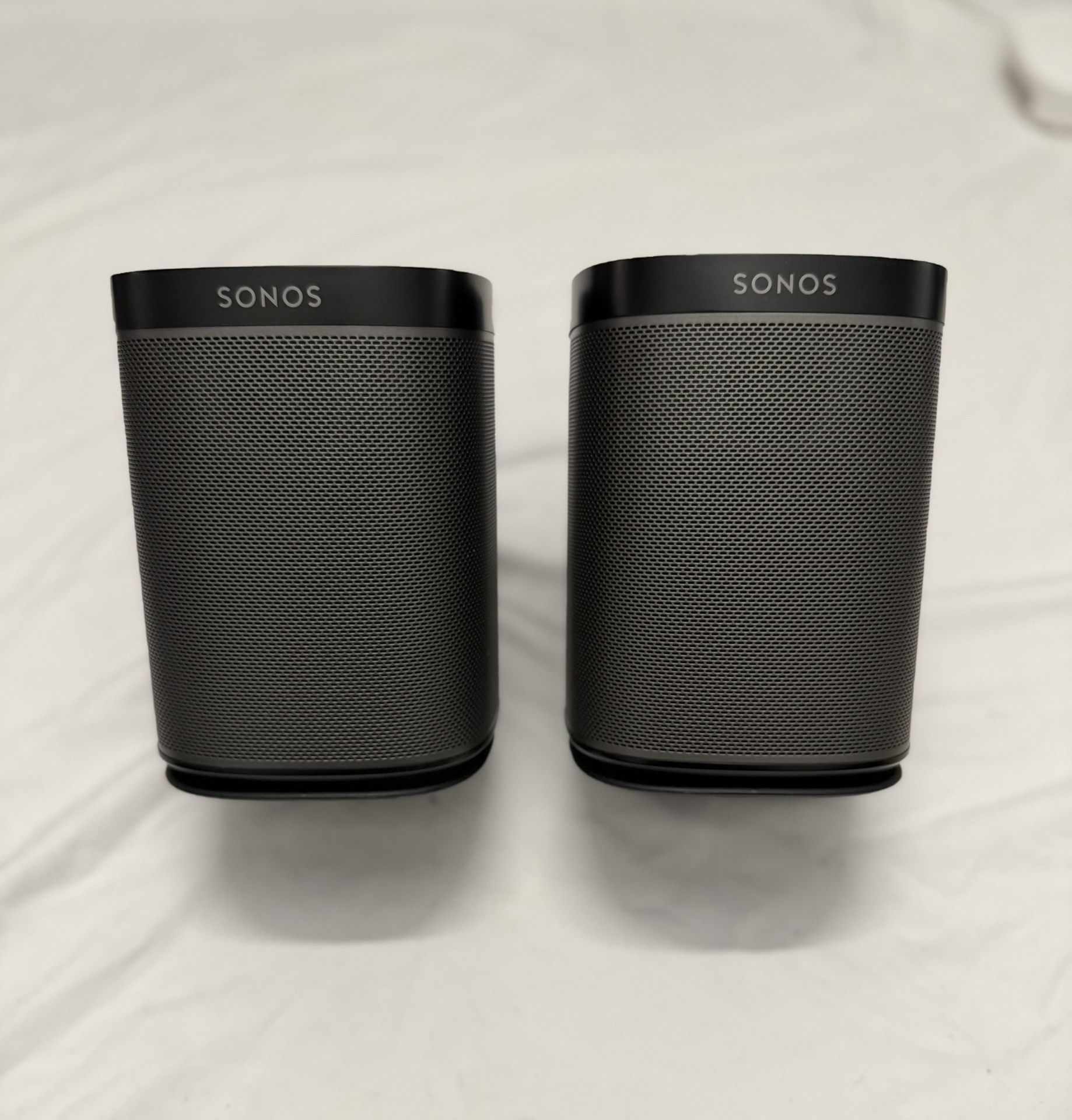 Two Sonos Play:1 speakers in excellent condition. Crisp sound, great for surrounds or smaller rooms. Includes premium wall-mount brackets and power cables. Both have touch controls and work with the Sonos app. Includes: • 2 × Sonos Play:1 • 2 × Wall-mount brackets • Power cables