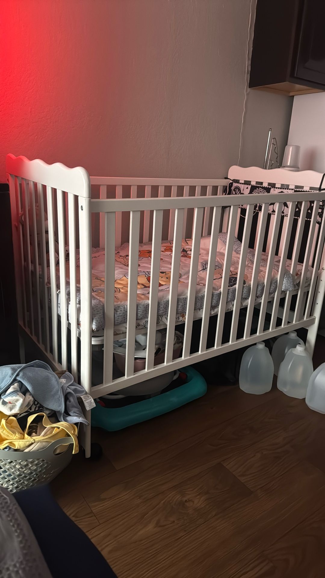 Mattress not included- we really don’t use it and one of the wheels are not on I’m just lazy to put it on since we don’t use it
