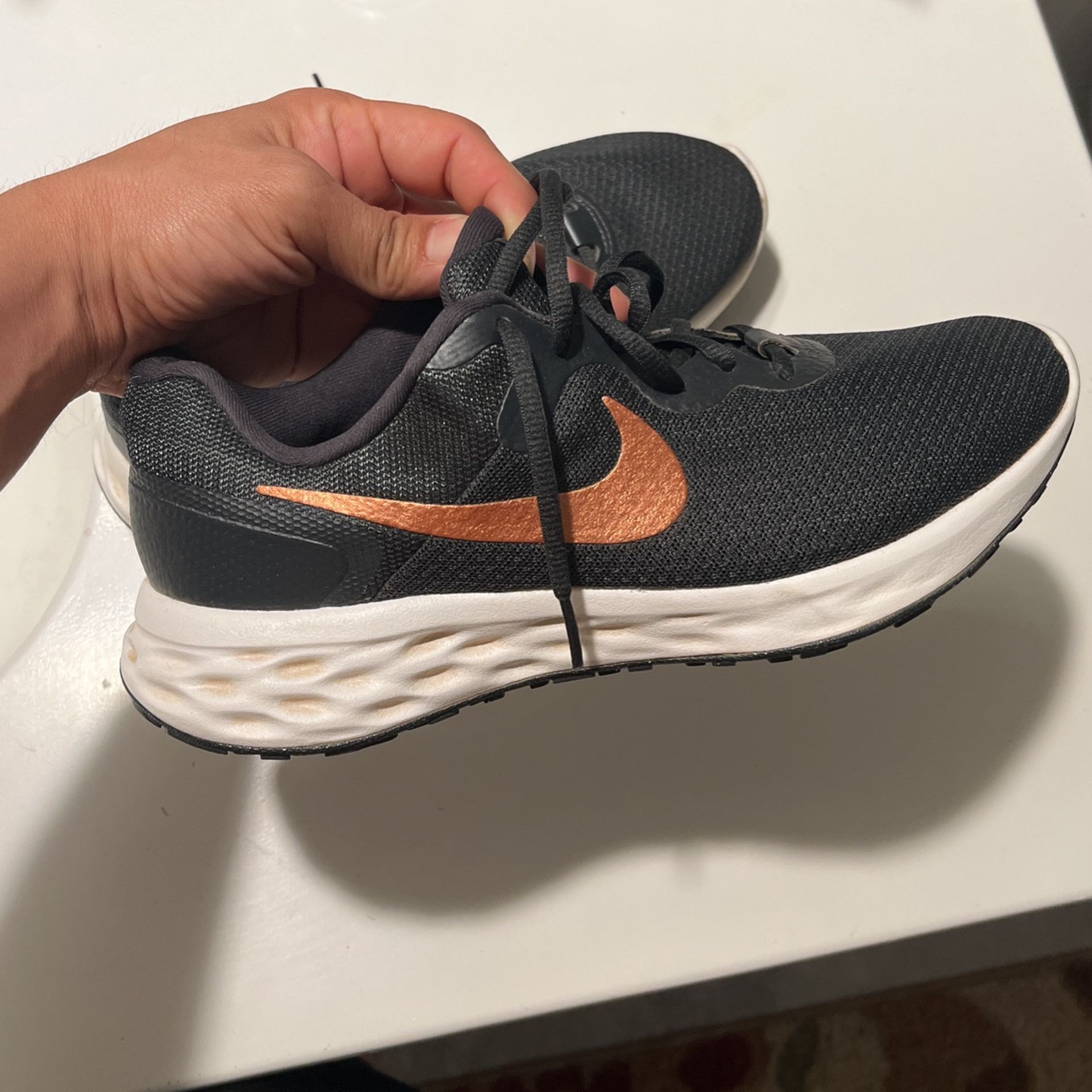 Lightly used shoes. Size 9 Gray and rose gold check/swoosh Bottom of shoe show how lightly used they are as all the traction and grip is still good. Asking 45$