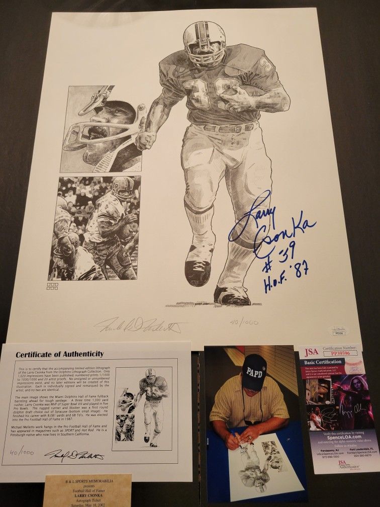 Miami Dolphins great Larry Csonka signed 16 X 20 limited edition 40/1000 black-and-white lithograph also signed by the artist Would make a great addition to any Miami Dolphins fan. ( JSA certified )