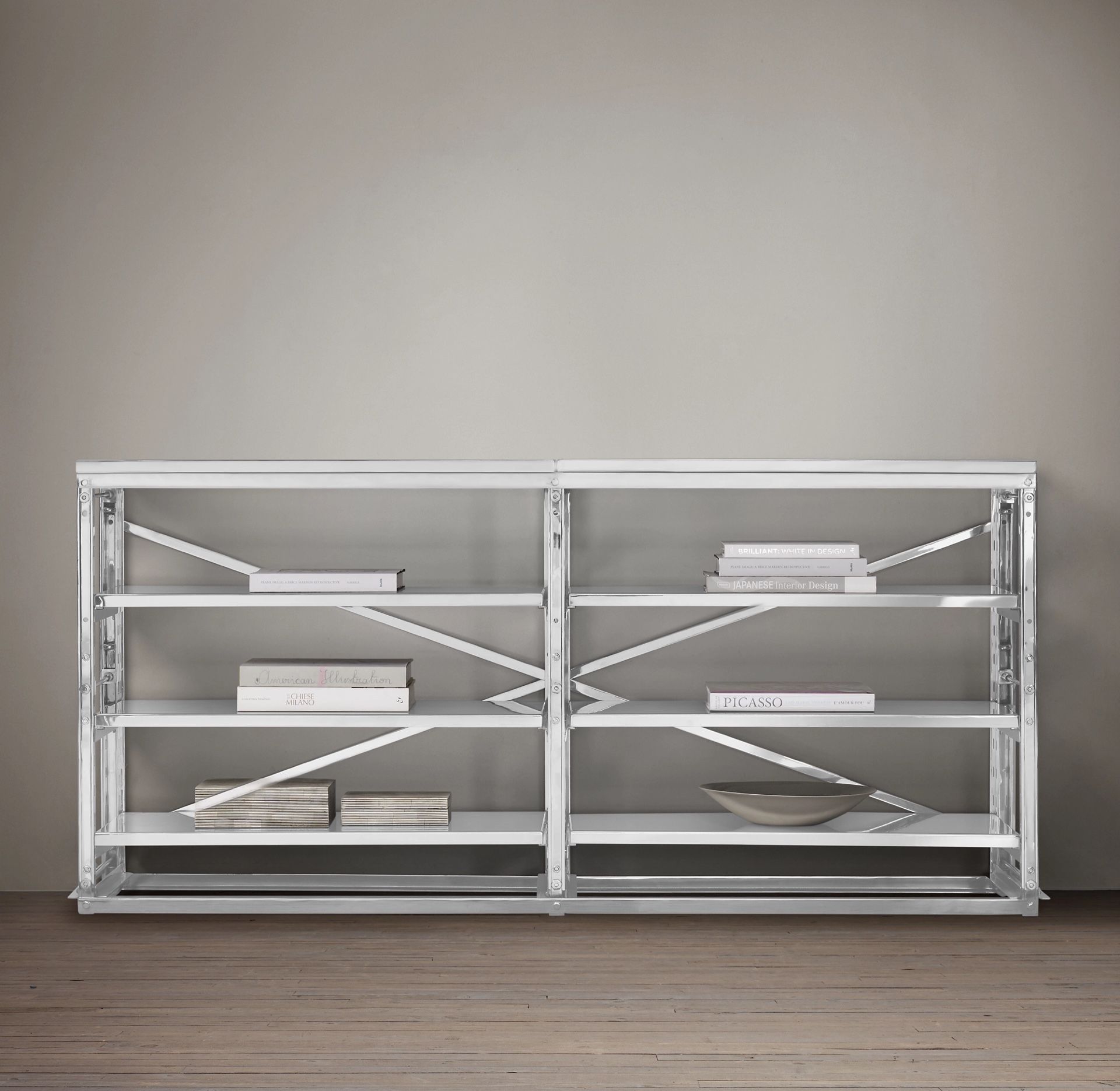 RH FRENCH LIBRARY CONSOLE TABLE Beautiful, sturdy and well cared for silver chrome Restoration Hardware Entertainment Center / Console table. Chic industrial minimalist vibe. 2 adjustable metal shelves (NOT 4 AS SEEN IN PHOTO) and 2 base shelves. One owner. Dimensions: 72"W x 15"D x 34"H