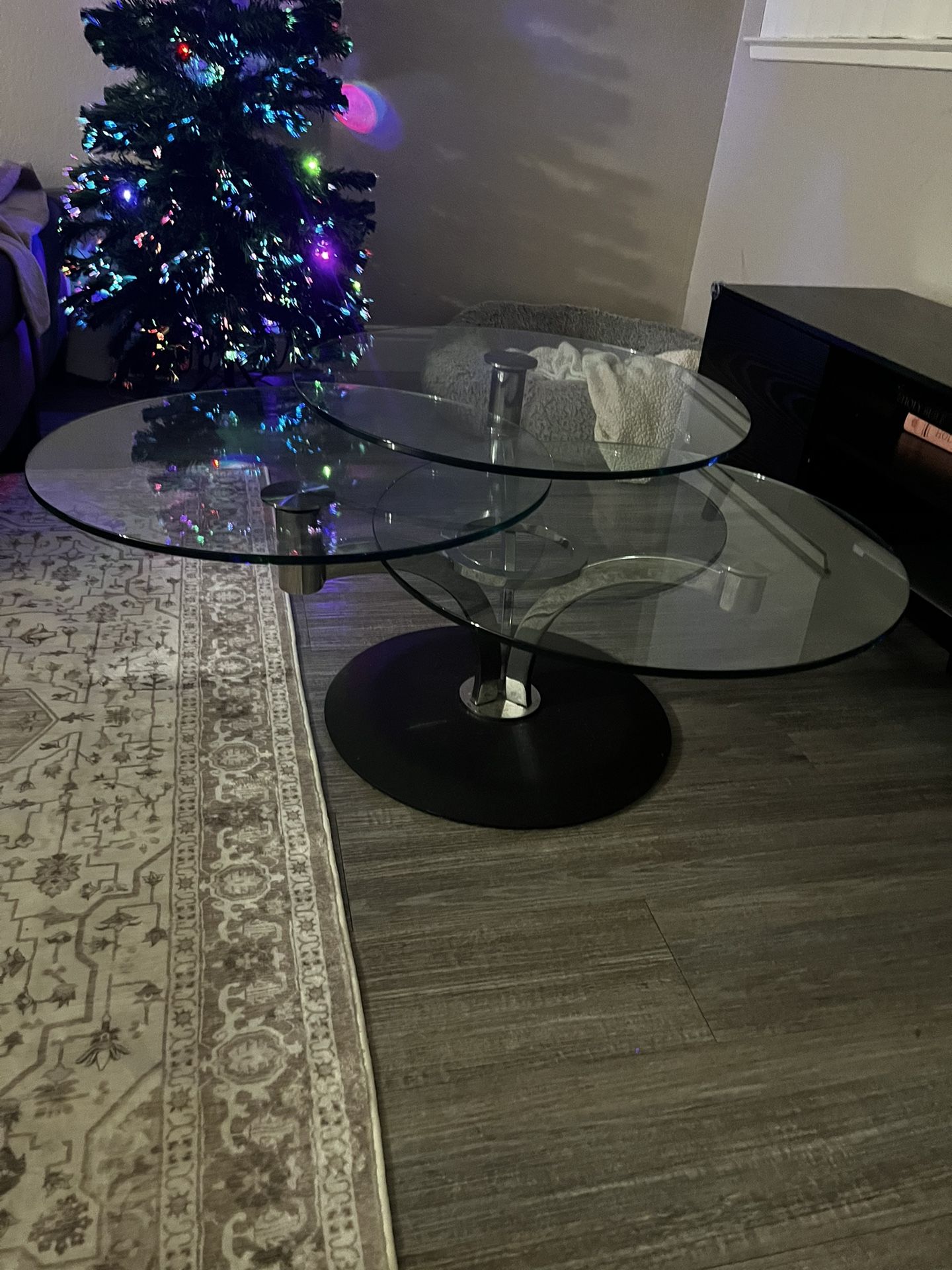Sturdy, modern glass coffee table with a sleek black base. Features three thick glass table tops that can be adjusted and rotated to create more or less surface space depending on your layout. Very solid and heavy—excellent quality. Details: • Thick, durable glass • Adjustable 3-piece design • Black base • Approx. 16 inches tall (base to top) • No scratches, cracks, or damage • Clean and well maintained Only selling because I’m switching to a different style.