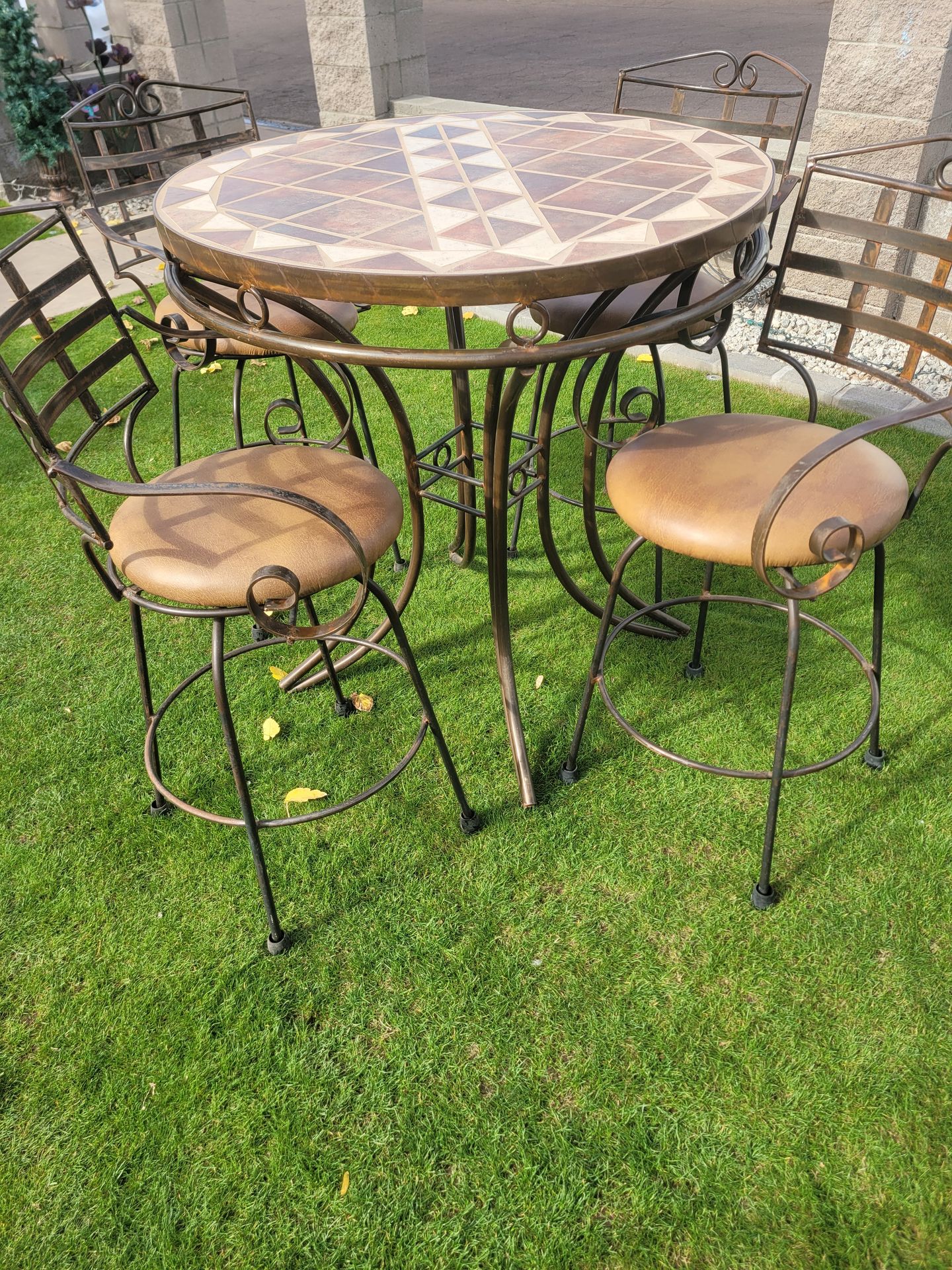 Outdoor Bar-height Patio Set Table and 4 swivel bar stools Iron frame Cross streets, 43rd Ave & Bethany home Mesa y sillas altas de patio Outdoor-Patio-Garden-Bistro-Furniture