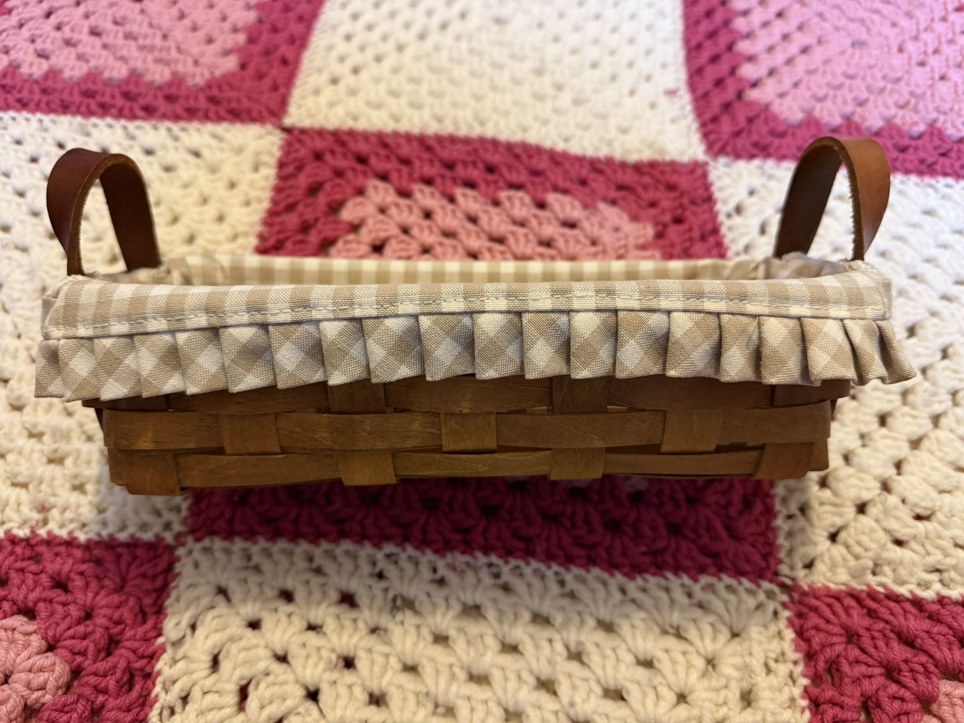 Gerald E Henn handmade cracker basket with leather handles and fabric liner. Excellent condition