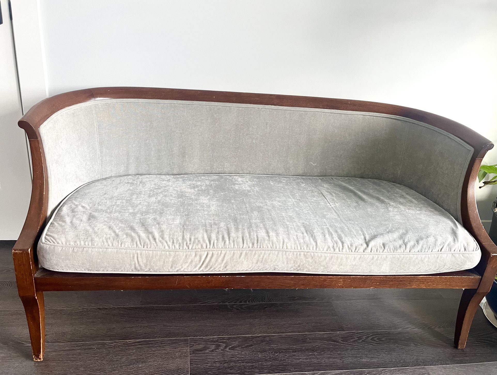 This is a vintage French settee that has been reupholstered with a cotton velvet grey fabric (the fabric alone cost more than $300). The settee has been sitting in our guest room, rarely used. measurements: 27” high, 57” length, 25” depth Cash only please Loveseat, bench, couch, sofa.
