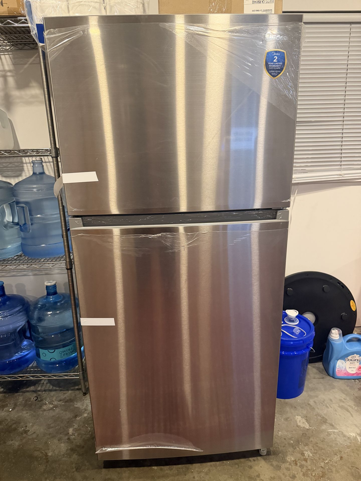 New never used has 2 year warranty ,no dents , Not a return, bought it new from the store for my parents but turns out they didn’t need it after all Midea 18.1-cu ft Top-Freezer Refrigerator (Fingerprint Resistant Stainless Steel), which offers both a wide range of convenient features and energy-efficient performance. The internal LED lighting ensures that you can always find what you're looking for, while the electronic control panel makes temperature adjustments a breeze. Humidity-controlled crisper drawers keep your produce fresh, and the reversible door allows for flexible installation. The top-freezer design puts frozen foods at eye level for easy access. Bring home this refrigerator today to optimize your food storage capabilities and keep your kitchen running smoothly. ENERGY STAR Certified: This refrigerator exceeds government energy efficiency standards so that you can save money, conserve energy, and still enjoy the features you love. • Garage Ready Performance: Designed and tested to maintain optimal performance at ambient temperatures ranging from 38 F to 110 F, making it ideal for your basement or garage. • Spacious Capacity: Enjoy 18.1 cubic feet of storage in a versatile, seamless design that maximizes your kitchen space without sacrificing style or performance. • Frost-Free Technology: The freezer compartment automatically defrosts itself, saving you the time and effort of a manual defrost. • Electronic Control: The user-friendly control panel lets you make temperature adjustments with ease. • Multi-Flow Cooling: Strategically placed vents evenly distribute cool air throughout the refrigerator, ensuring that ideal temperatures are maintained in every interior space. • Ice Maker Ready: Compatible with the IM1900MD model (sold separately). • ADA Compliant: This ADA-compliant product is designed with accessibility in mind, ensuring safe, simple, and reliable operation.
