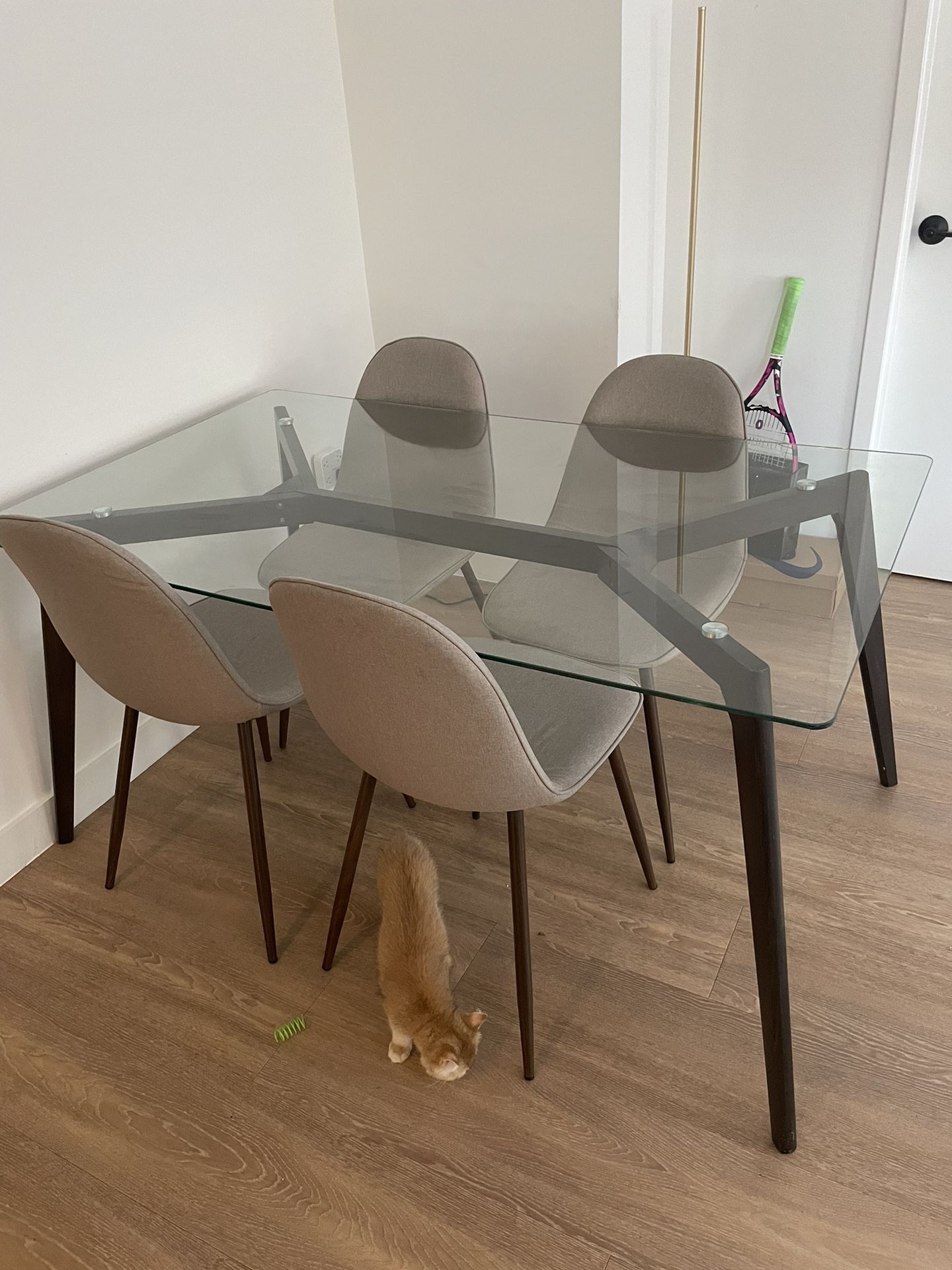 No signs of wear. Great modern glass dining table with wood accents. 35.25"x59" Price includes chairs (negotiable). Cat not included... May have to disassemble yourself but it's a really good table. Pick-up only!