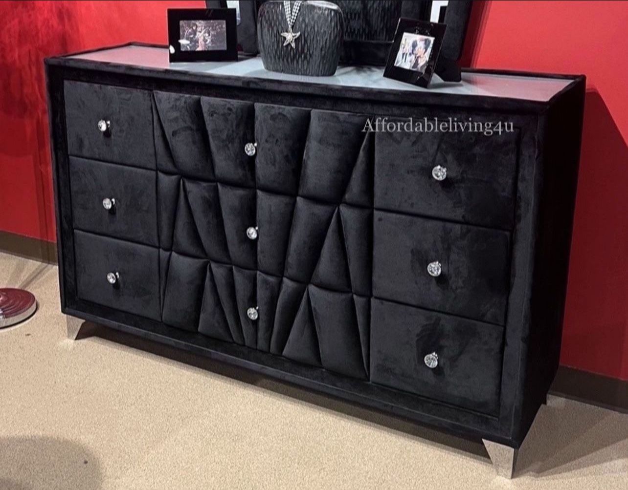 Black Velvet Dresser W/ Acrylic Crystal Knobs Brand New In Box