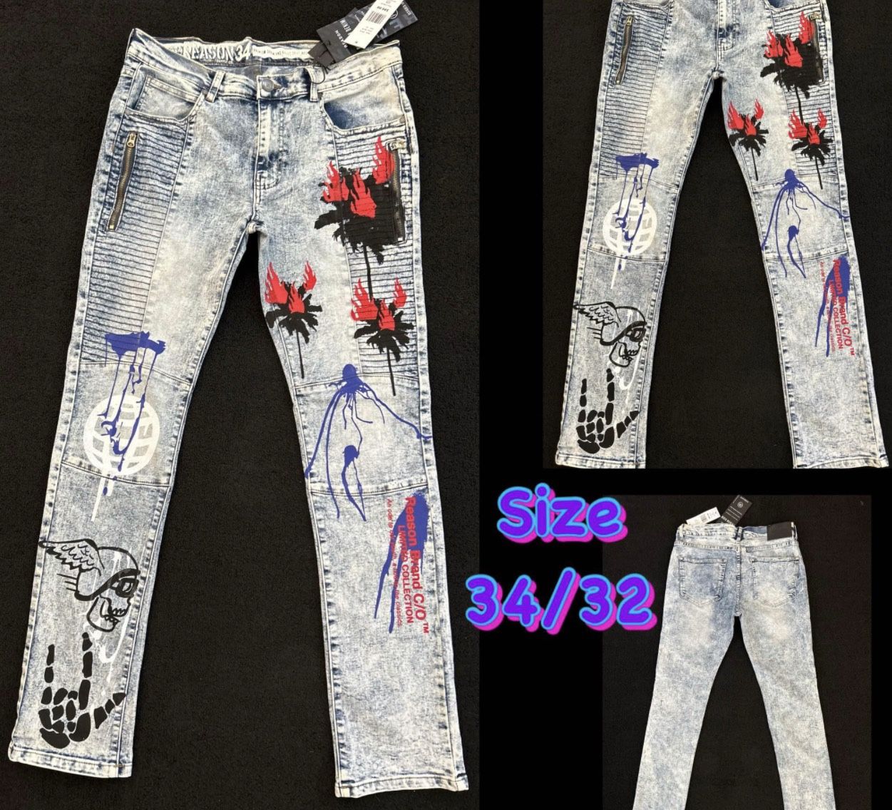 Brand new size 34. Super stretchy, acid wash, relaxed fit length is 33.