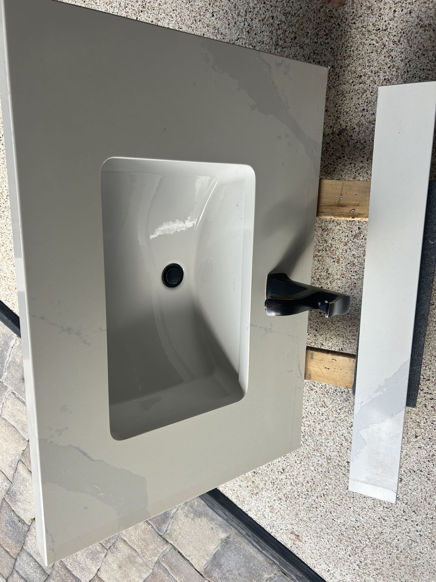 Stone vanity top with backsplash, Kohler sink and Hansgrohe faucet and pop up drain. Top - 23”x 32 3/4” x 2” Sink - 11 1/2” x 18” Underneath size - 21 7/8” x 31 1/2” Excellent condition