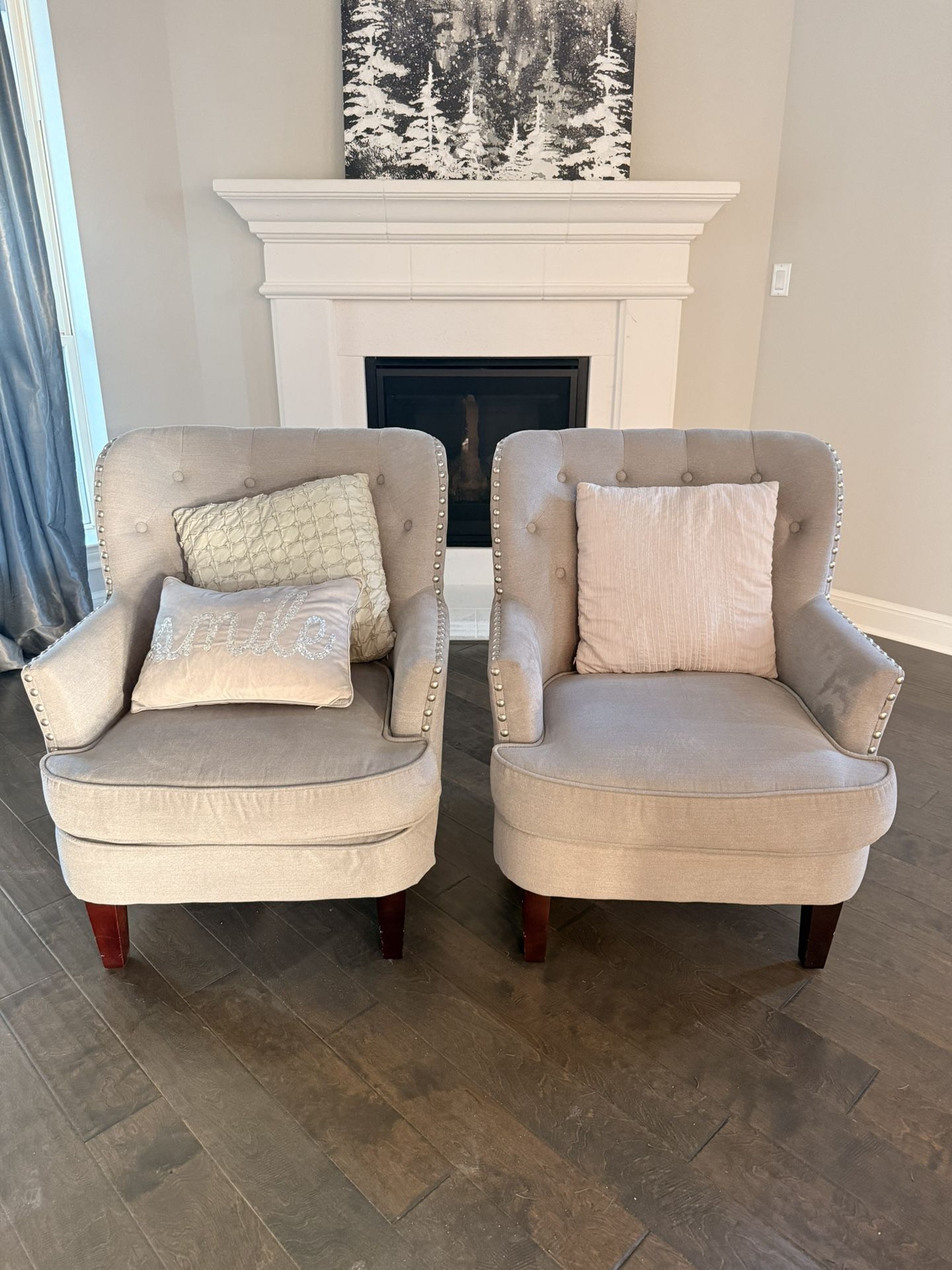 Beautiful pair of Wayfair Chrisanna Wingback Accent Chairs in gray polyester upholstery with classic tufted backs and decorative nailhead trim. These chairs are stylish, comfortable, and perfect for a living room, bedroom, office, or reading space. Originally purchased from Wayfair for $279 each ($545 total). Details • Brand: Wayfair • Model: Chrisanna Wingback Chair • Color: Gray • Material: Polyester upholstery • Dimensions: 33” W x 31” D • Tufted back design • Decorative nailhead trim • Solid wood legs Selling as a set of two chairs. Pickup only Buyer responsible for moving and transport. Message if interested.