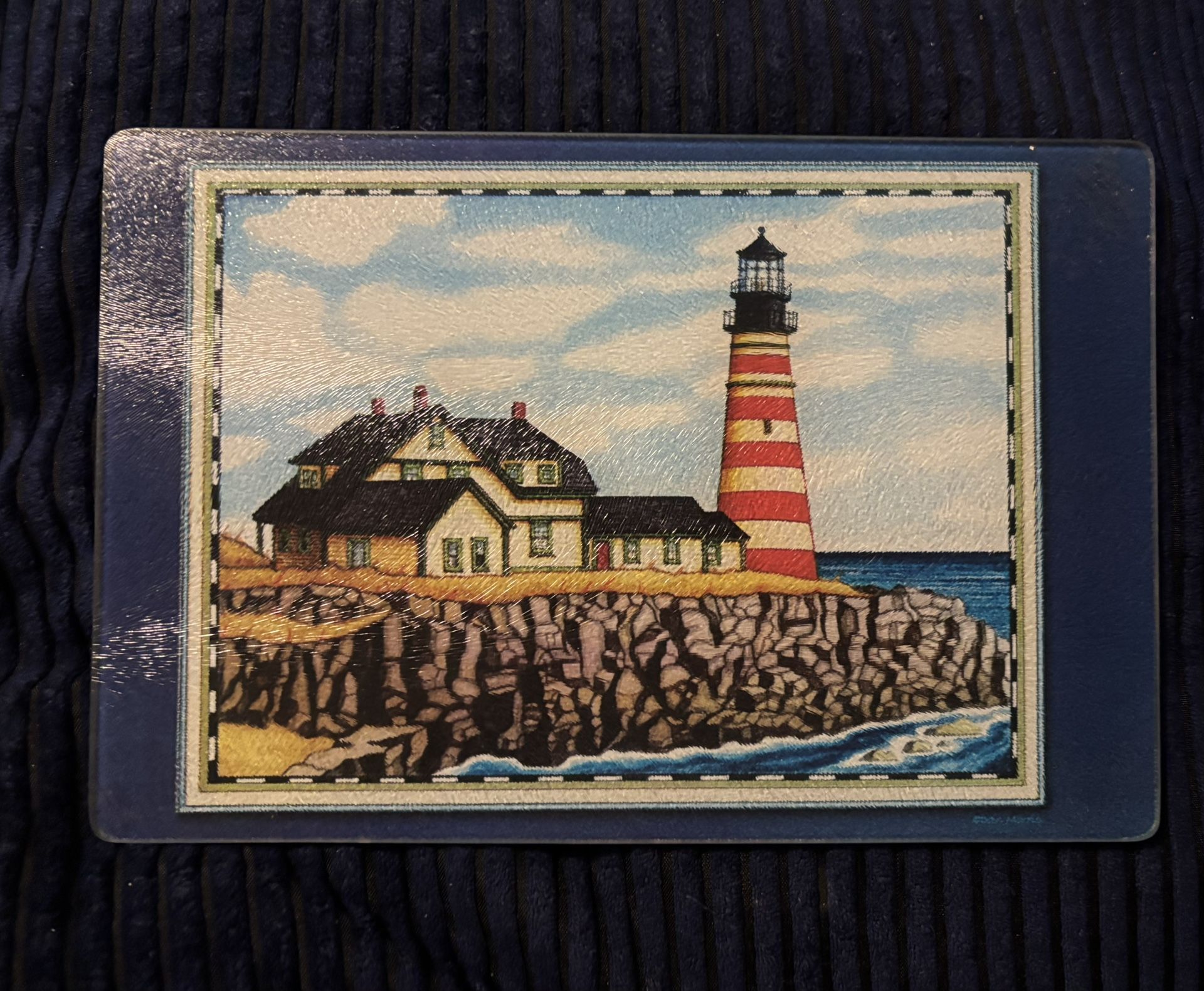Like new glass cutting board featuring a lighthouse and cottage by the sea. Vibrant red and white stripes on the lighthouse. Perfect for collectors, entertaining and decor. Pick up in Westminster