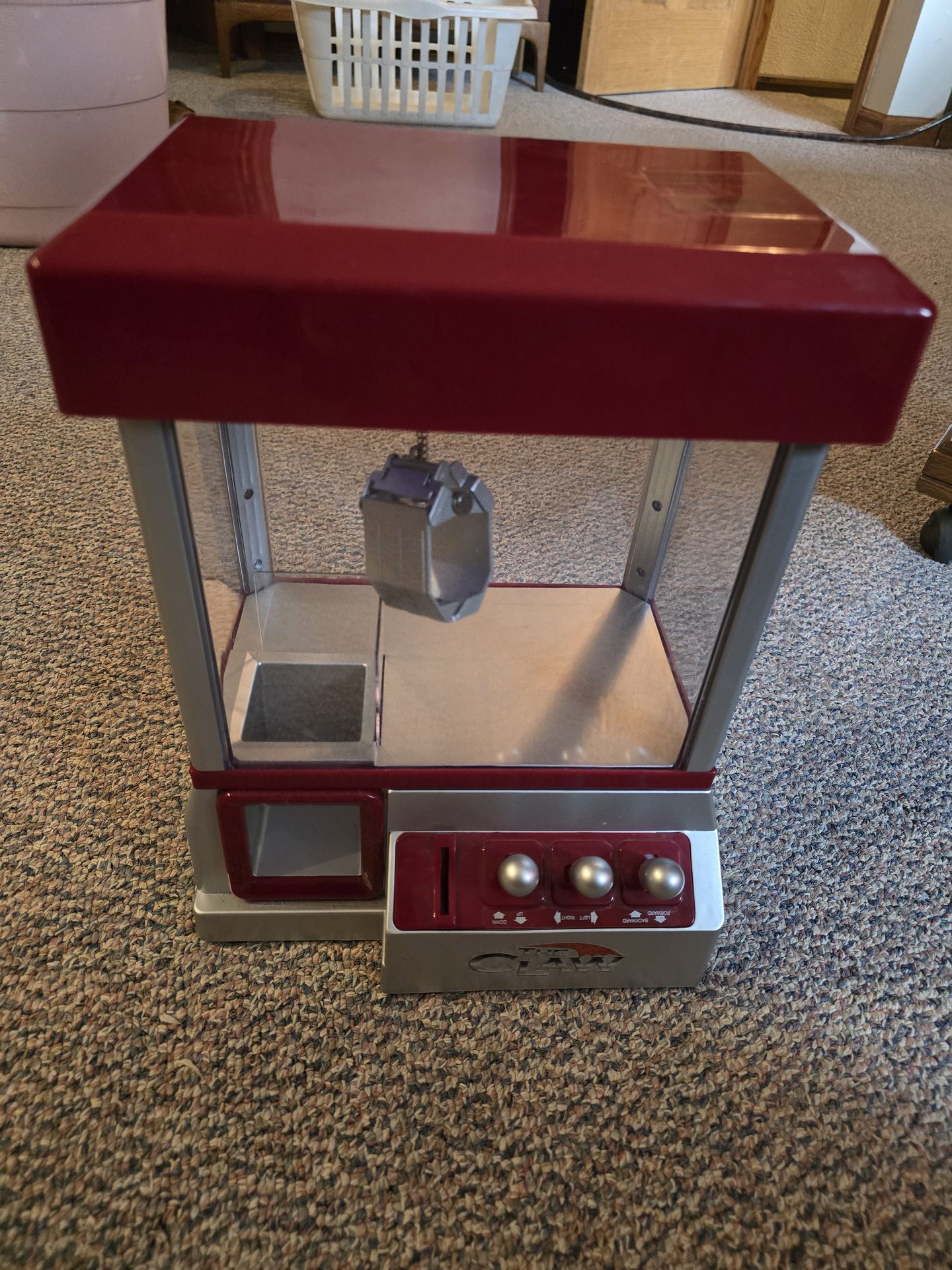 Claw Machine game with tokens. Small for kids. Missing battery cover panel.