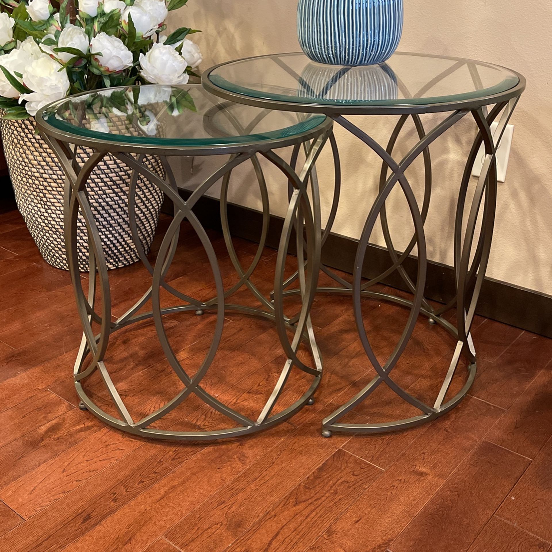Tanner Round Metal frame nesting end table with a glass top, set of 2 pcs from Pier 1 store. Very good condition. Diameter 18” & 20-1/2” ; height 19” & 21”.