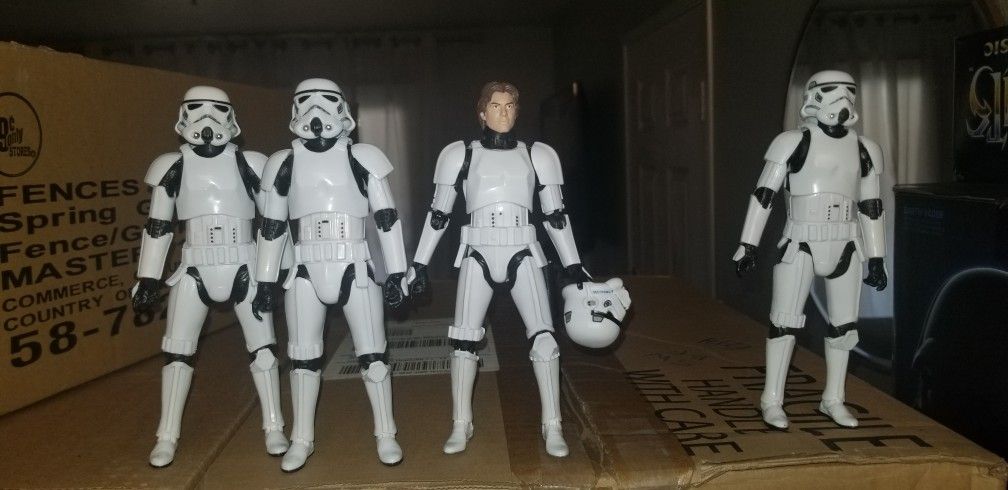 Star Wars Black Series Stormtrooper figures. 3 Stormtroopers with the new mold and 1 Stormtrooper with the old mold as Han Solo disguise . All come complete with blasters.